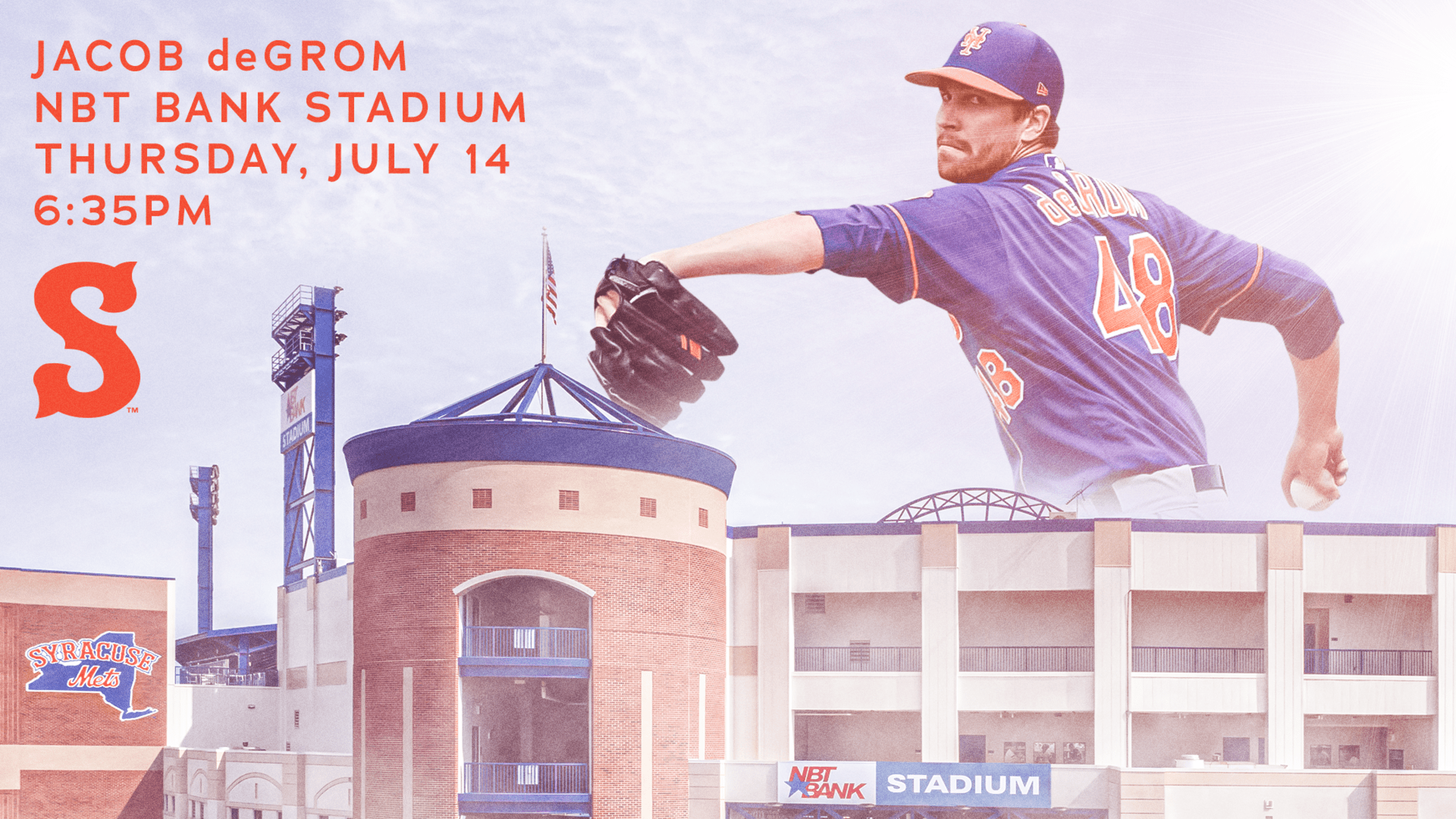 Syracuse, NY – New York Mets starting pitcher Jacob deGrom is scheduled to pitch for the Syracuse Mets on Thursday, July 14th as part of his Major League rehab assignment. Jacob deGrom won the 2018 and 2019 National League Cy Young Awards, given annually to the best pitcher in the National League, and deGrom is also a four-time All-Star and was the 2014 National League Rookie of the Year. Syracuse is hosting the Jacksonville Jumbo Shrimp (Triple-A Miami Marlins) on Thursday at NBT Bank Stadium with first pitch slated for 6:35 p.m.