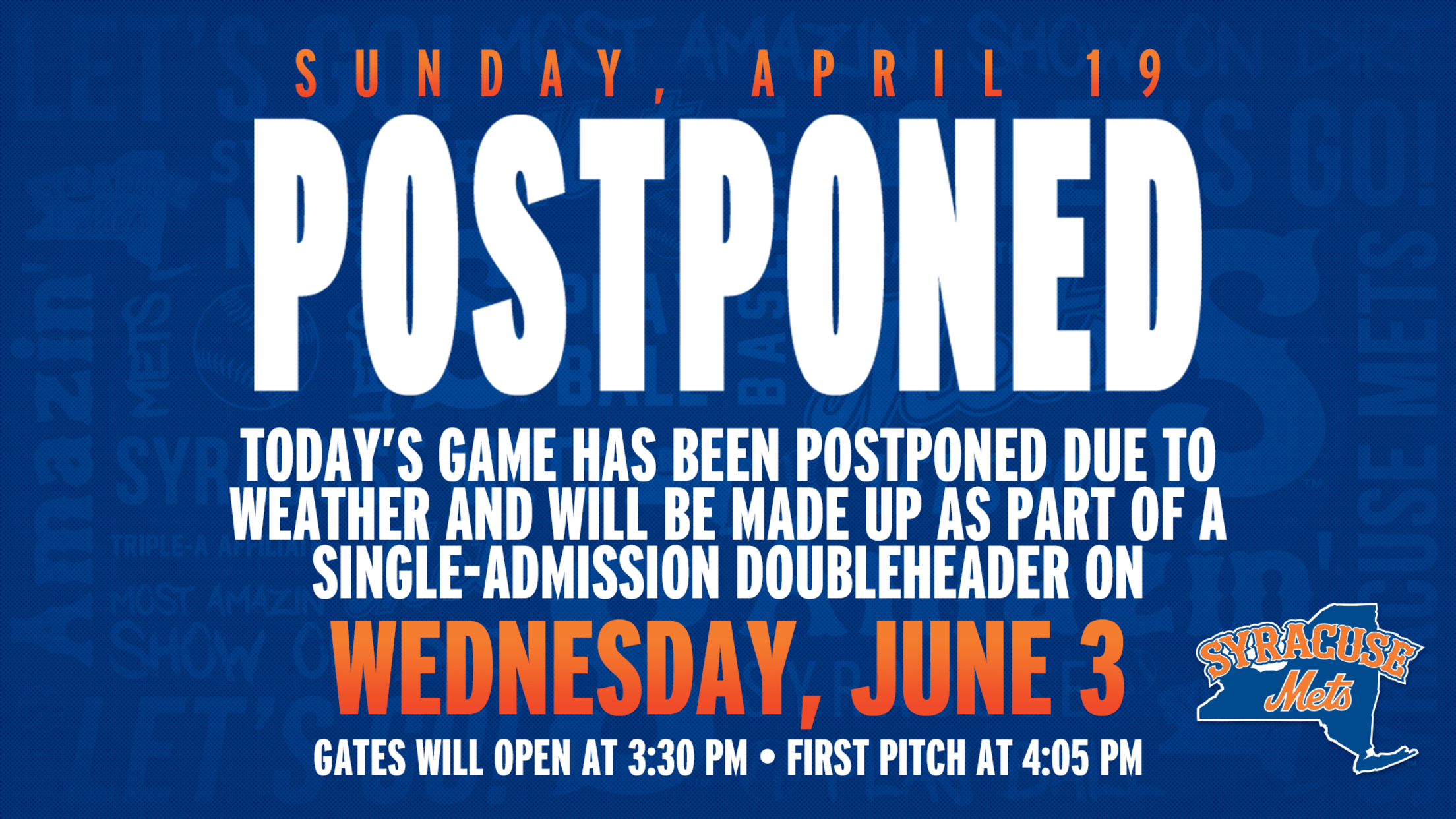 Fans with tickets for today's postponed game may redeem those tickets for any other Syracuse Mets home game at NBT Bank Stadium for one calendar year from today's date - April 19th, 2026. Seating is subject to availability, and tickets can be redeemed at the Syracuse Mets Ticket Office or by calling 315-474-7833.