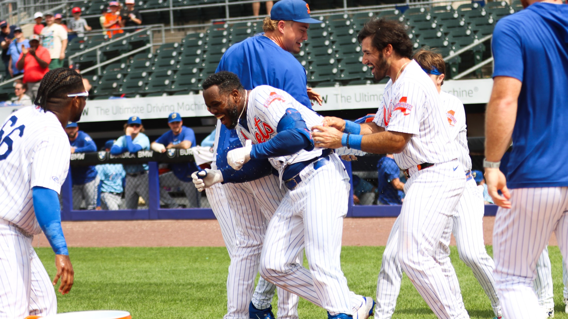 Luis De Los Santos celebrates with his teammates at home plate after his walk-off, two-run home run for Syracuse on Sunday afternoon at NBT Bank Stadium. (Kylie Richelle)