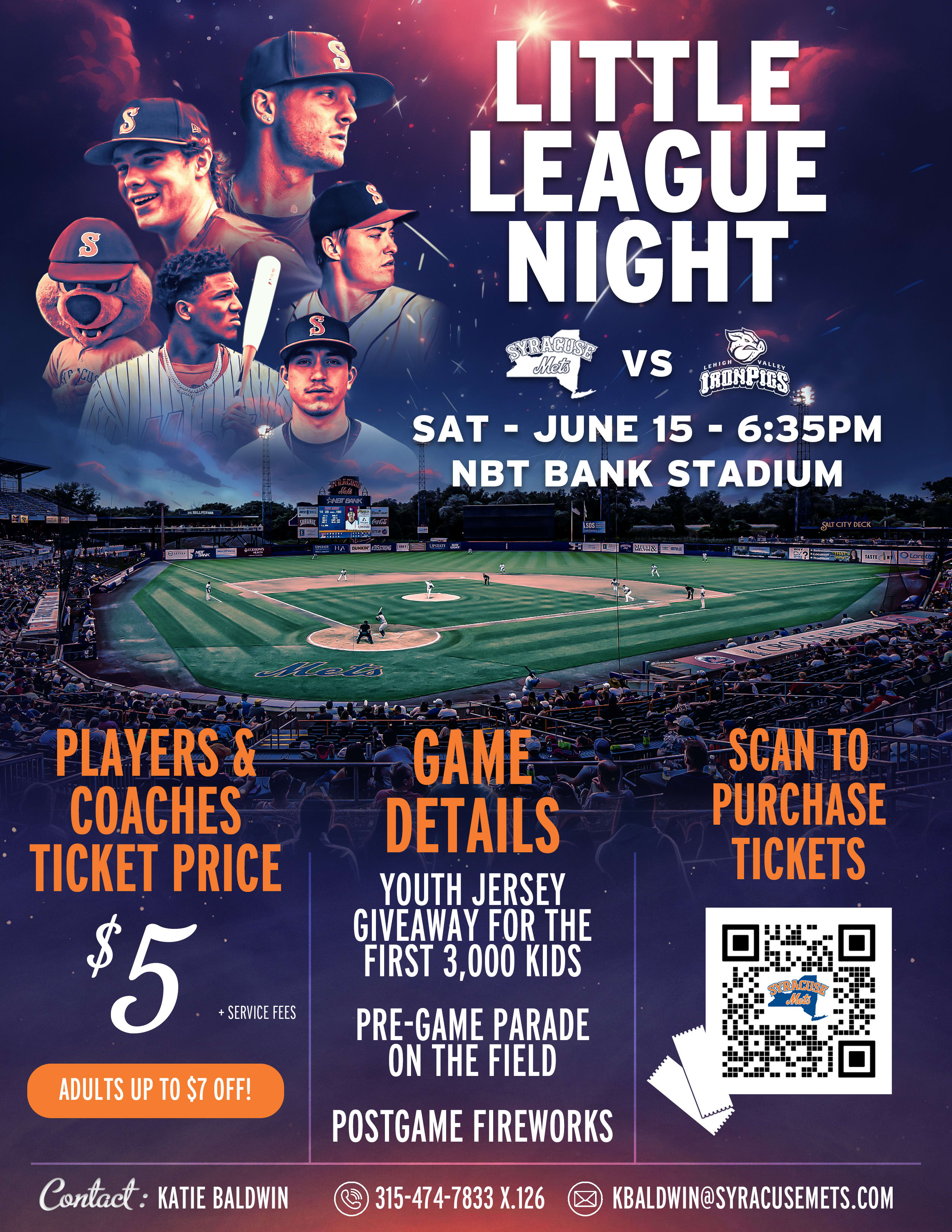 - For discounted little leaguer tickets, contact Katie Baldwin at [email protected] or 315-474-7833 x107 or for more info, click here