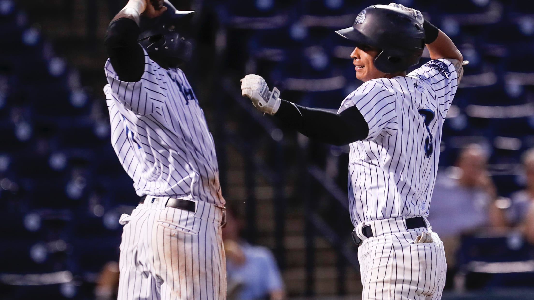 Estevan Florial (left) and Oswaldo Cabrera celebrate after Cabrera smashed his second home run of the game - a go-ahead, 2-out, 2-run blast tor right-center - in Tampa's 6-5 win over Lakeland on Saturday night at George M. Steinbrenner Field. (Mark LoMoglio)