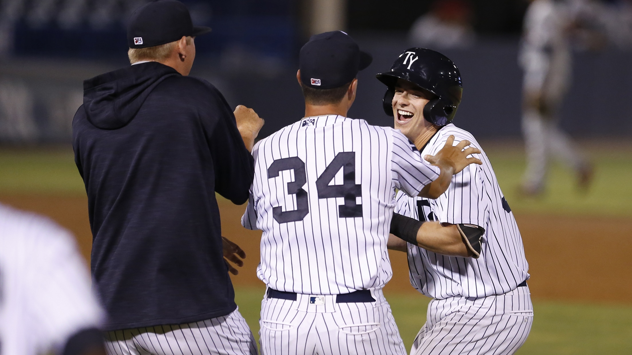 Nick Solak (right) celebrates with teammates after hitting a walk-off RBI single, giving the Tampa Yankees a 3-2 win on Wednesday night at George M. Steinbrenner Field.