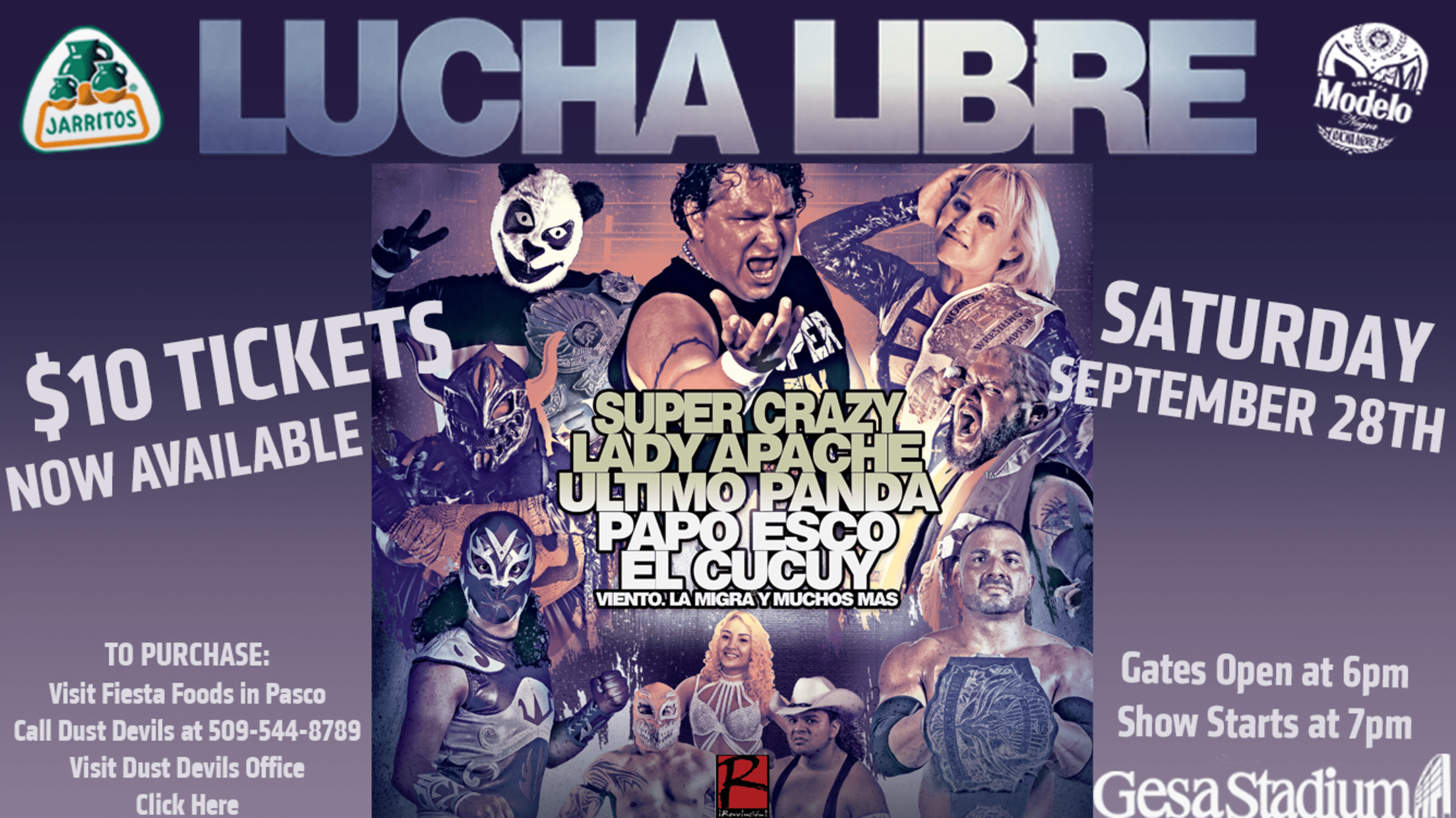 Luchadores at Gesa Stadium!The Tri-City Dust Devils are excited to announce pro Wrestling revolution Lucha Libre presented by Cerveza Modelo and Jarriots! Gesa Stadium will play host to an exciting evening of colorful, high flying Lucha Libre action you won't want to miss on Saturday, September 28th! With headliner Super Crazy