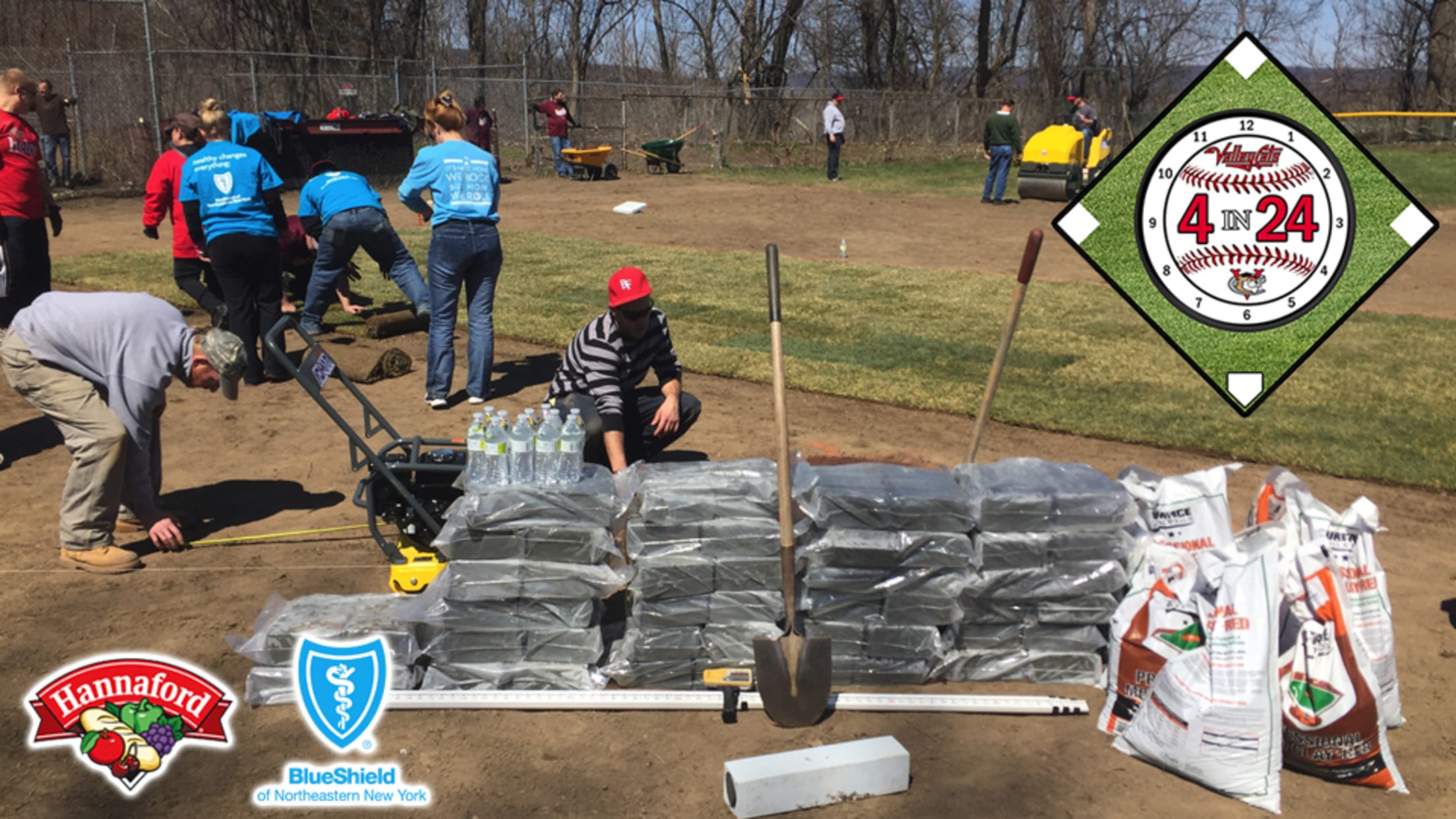 The '4 in 24' Field Renovation Project is a collaborative effort between the ValleyCats, BlueShield of Northeastern New York and Hannaford Supermarkets that takes place each April. In less than 24 hours, four youth ball fields receive a complete infield overhaul. The project's mission is to assist local youth leagues with the maintenance and upkeep of their playing fields, allowing for a safe place for children to learn and play ball. Following the 2018 '4 in 24' project, over 30 fields will have been revamped, impacting thousands of local youth ballplayers.