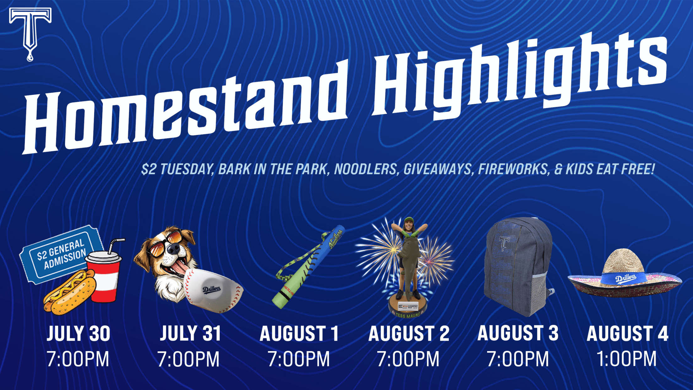 The six games are filled with great promotions, starting with $2 Tuesday for the opener on July 30. Wednesday, July 31 will be Bark-in-the-Park and $3 White Claws, followed by Triple Play Thursday and a Tulsa Noodlers Sling Can Cooler giveaway on August 1.