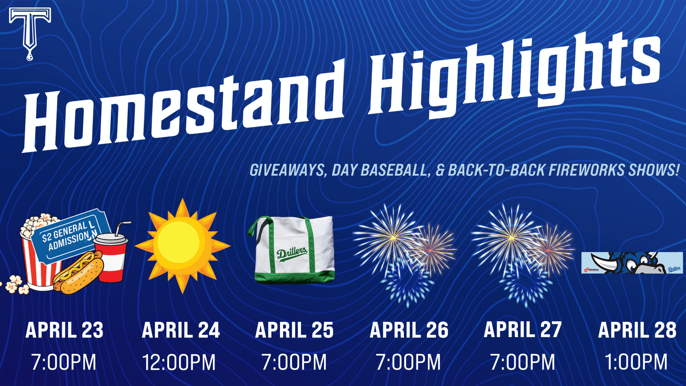 The series will conclude with FUNday Sunday on April 28. Kids, ages 12 and under, can eat for free and the first 500 young fans will receive a Drillers headband.