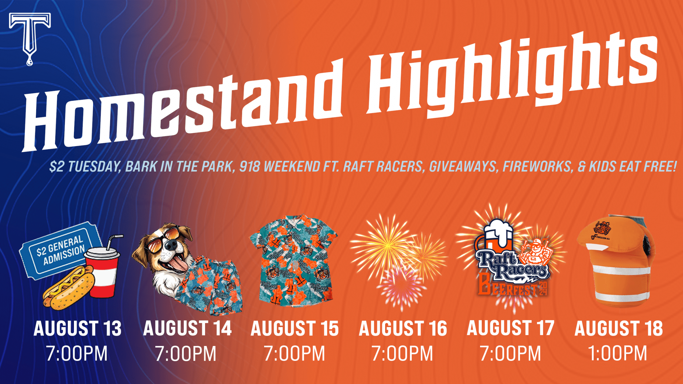 Following Friday Night Fireworks on August 16 and Grand Slam Saturday Fireworks on August 17, the series and home stand will conclude with the final FUNday Sunday of the season on August 18. For the finale, the first 500 fans will receive Raft Racers Life Jacket Koozies. Kids will have the chance to go on the field before the game to play catch, and then go back down to run the bases after game.