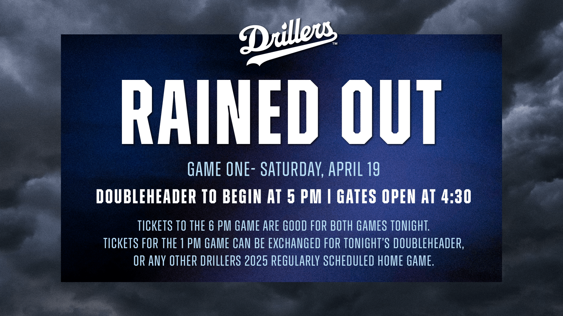 The Drillers and Wind Surge will now try to play a regular doubleheader later on Saturday with game one beginning at 5:00 p.m. with stadium gates opening at 4:30 p.m. Game two will start approximately 30 minutes after the conclusion of the first game. Both games are scheduled to consist of seven innings.