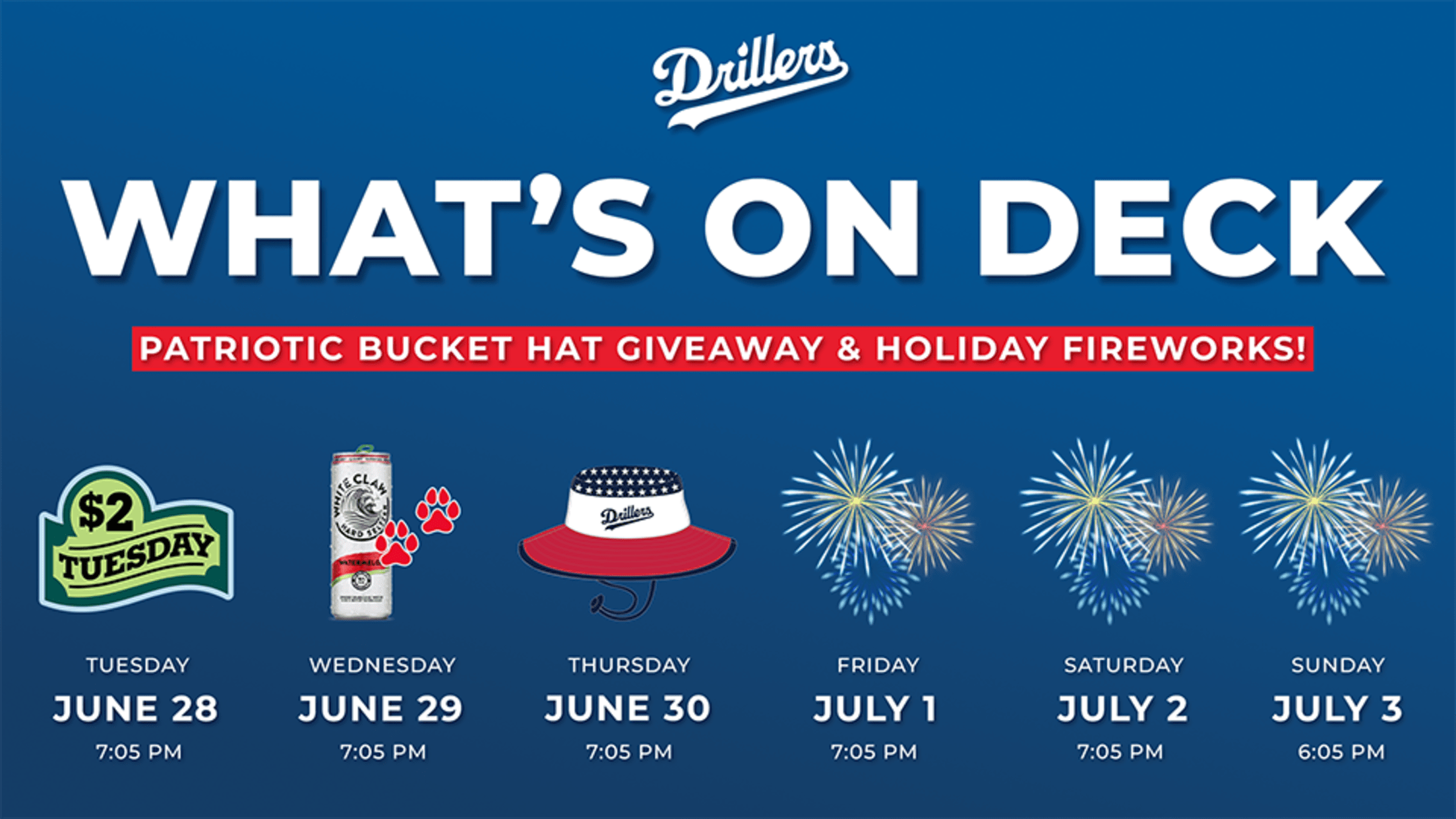 The first 1,000 fans to enter through either the Union Home Mortgage, Oil Derrick or Osage Casino Hotel/Greenwood gates will receive a patriotic-themed, Drillers bucket hat just in time for the Fourth of July!