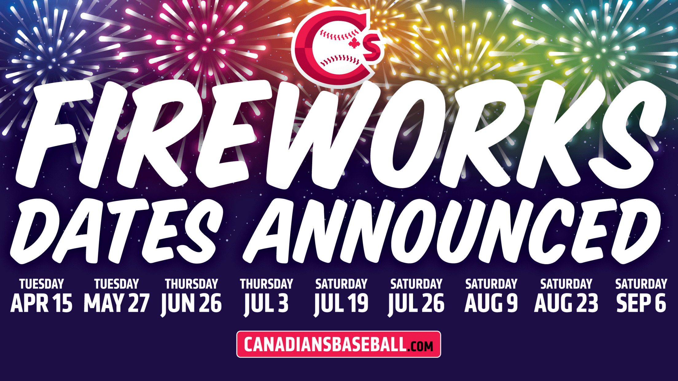 VANCOUVER, BC – Already one of the top pyrotechnic displays in all Minor League Baseball, Canadians postgame fireworks at Rogers Field at Nat Bailey Stadium will light up the Vancouver night on nine different dates next season. That’s three more than in 2024 and the most since the High-A era