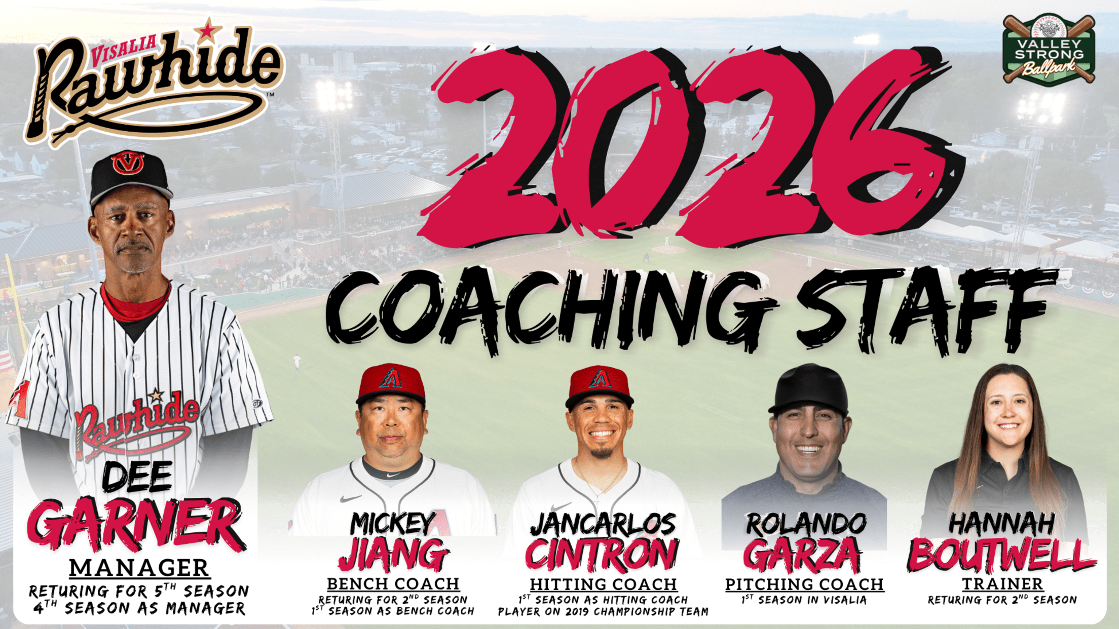 Visalia, CA – The Arizona Diamondbacks announced the Visalia Rawhide’s 2026 coaching staff on Friday. Manager Dee Garner leads the staff returning for his fourth season as Rawhide Manager. Jancarlos Cintron, a 2019 California League champion with Visalia as an infielder, joins the Rawhide as the hitting coach. Pitching coach