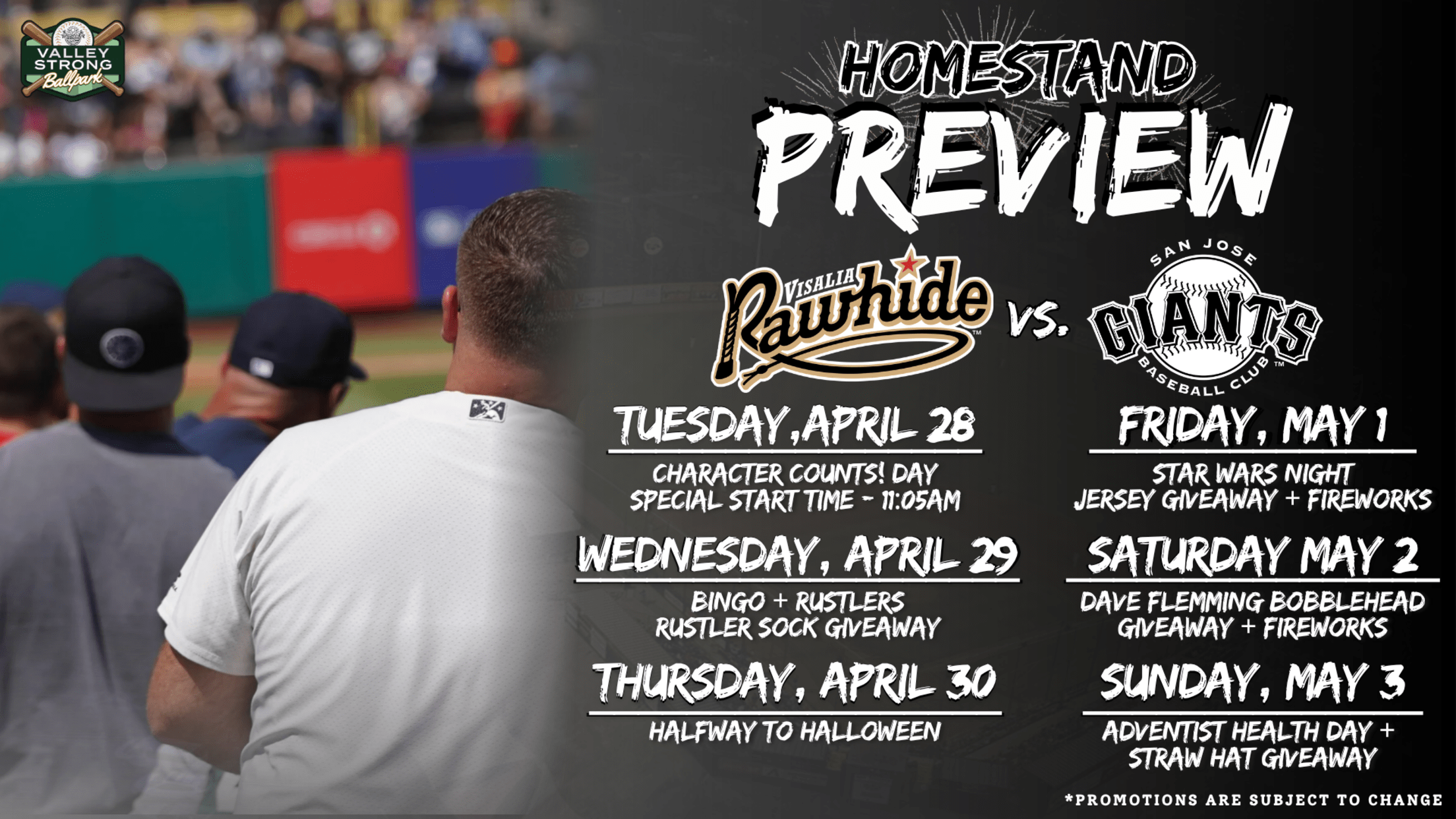 Visalia, CA – The Visalia Rawhide host the San Jose Giants for a six game set starting Tuesday at Valley Strong Ballpark. The week features a Halfway to Halloween celebration, Star Wars Night, two fireworks shows and four giveaways.