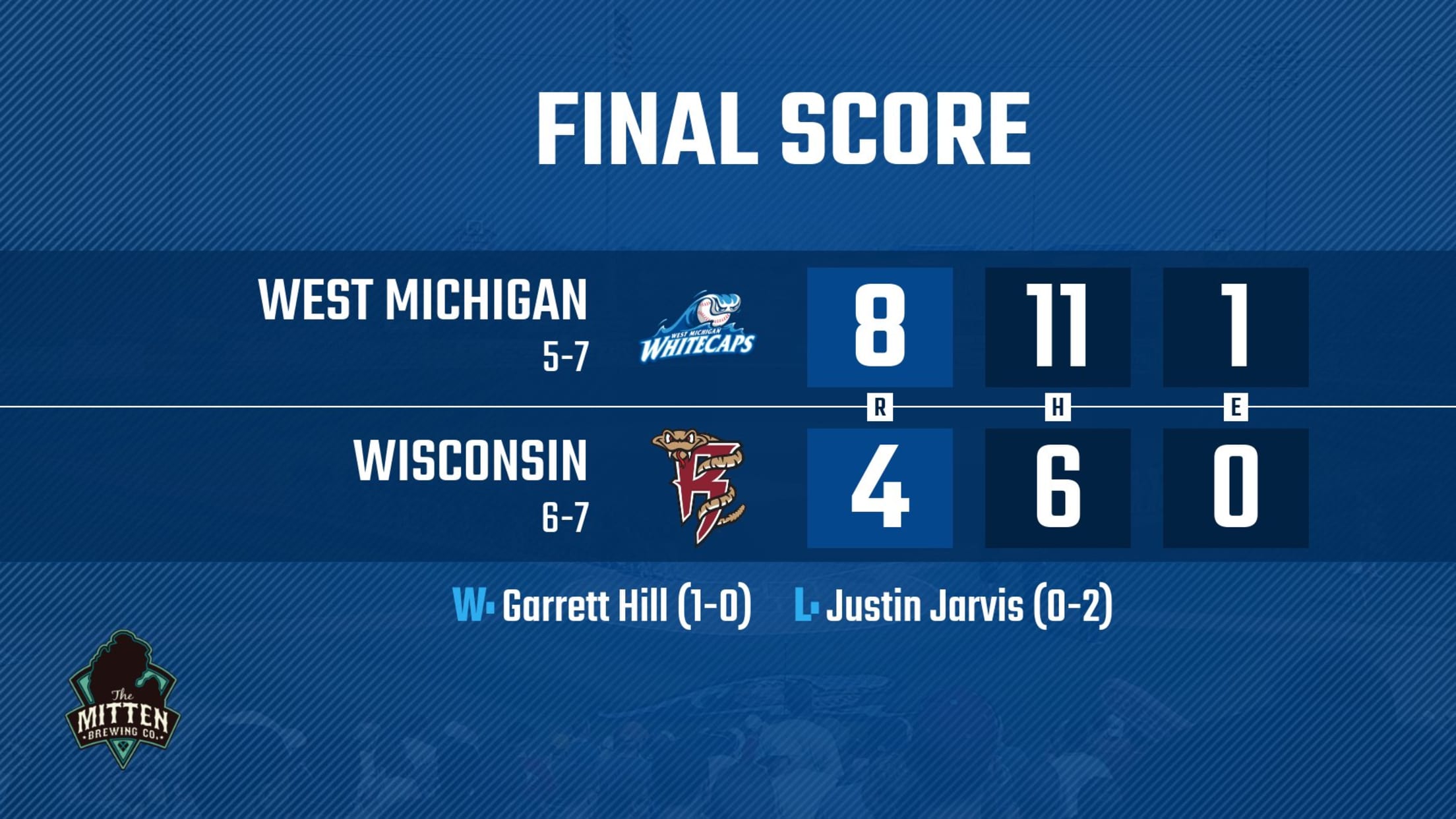 APPLETON- WI – The West Michigan Whitecaps were strong in all phases as part of an 8-4 victory over the Wisconsin Timber Rattlers in front of 1,230 fans Tuesday night at Fox Cities Stadium. On the mound, starting pitcher, Garrett Hill (1-0) dominated in five scoreless innings with a season-high