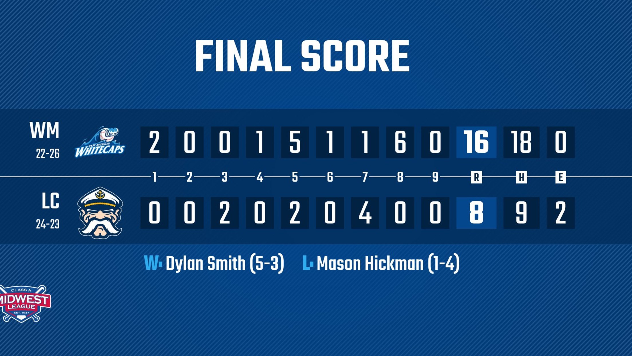 Tigers No. 9 prospect Dylan Smith (5-3) secures his fifth win, allowing four runs through five innings with three strikeouts. Captains starter Mason Hickman (1-4) suffers his fourth loss, surrendering three runs through 3.1 innings. The Whitecaps improve to 22-26 as the Captains fall to 24-23. The Whitecaps sent 42 batters to the plate in the win, surpassing the original record (40) set on May 18 in a 9-0 win over the Fort Wayne TinCaps.