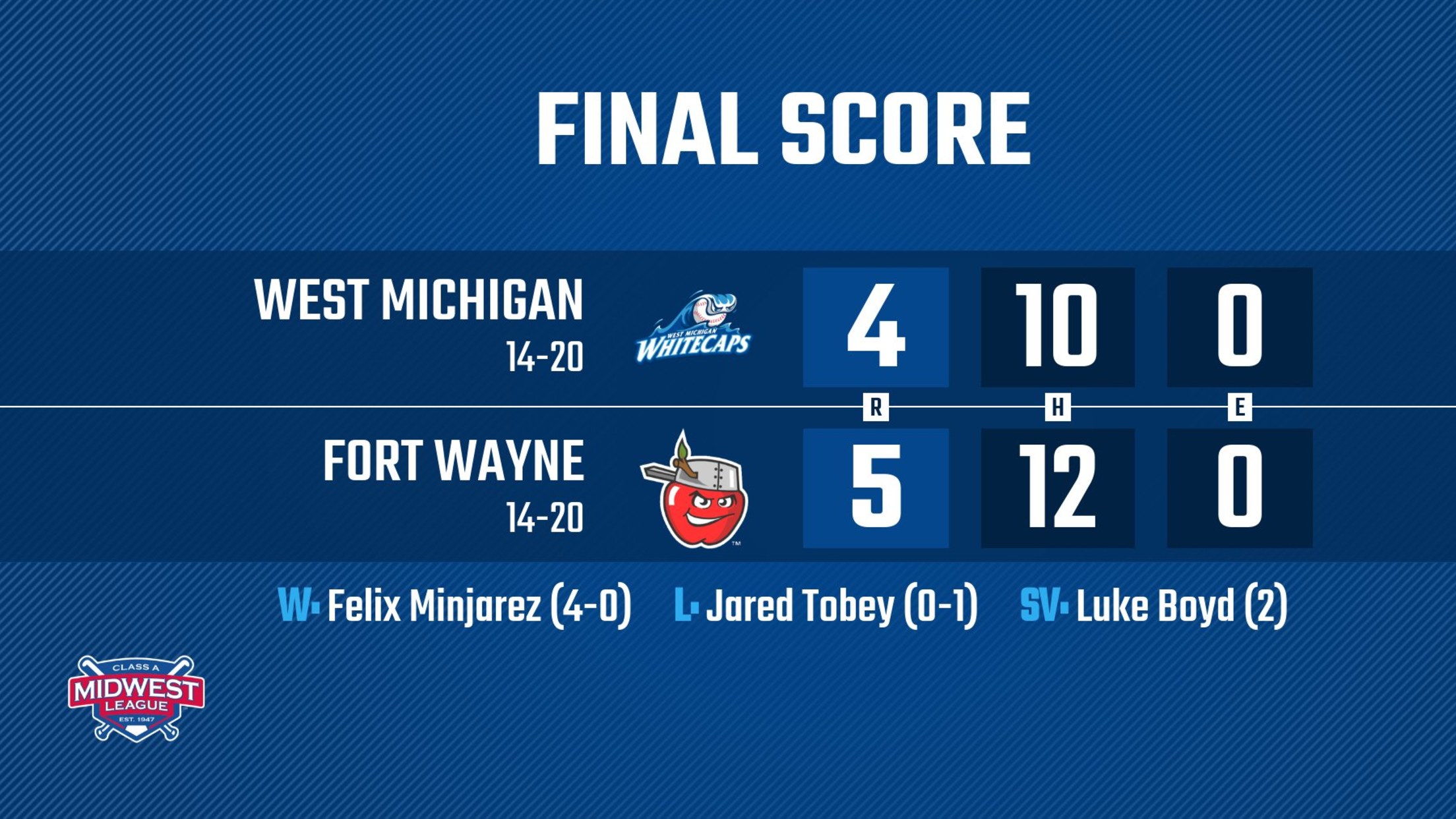 FORT WAYNE, IN – The West Michigan Whitecaps came up just short as part of a 5-4 loss to the Fort Wayne TinCaps in front of nearly 3,000 fans Tuesday at Parkview Field.