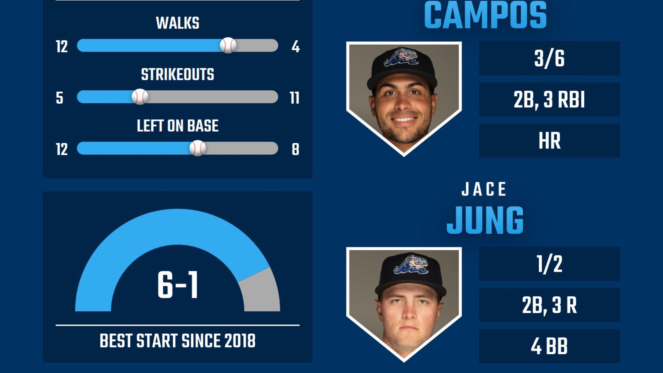 LANSING, MI - The West Michigan Whitecaps enjoyed 27 batters reaching base safely – one for every out in a nine-inning baseball game as Roberto Campos led the charge with his first High-A home run in a 14-6 victory over the Lansing Lugnuts on Friday night at Jackson Field.