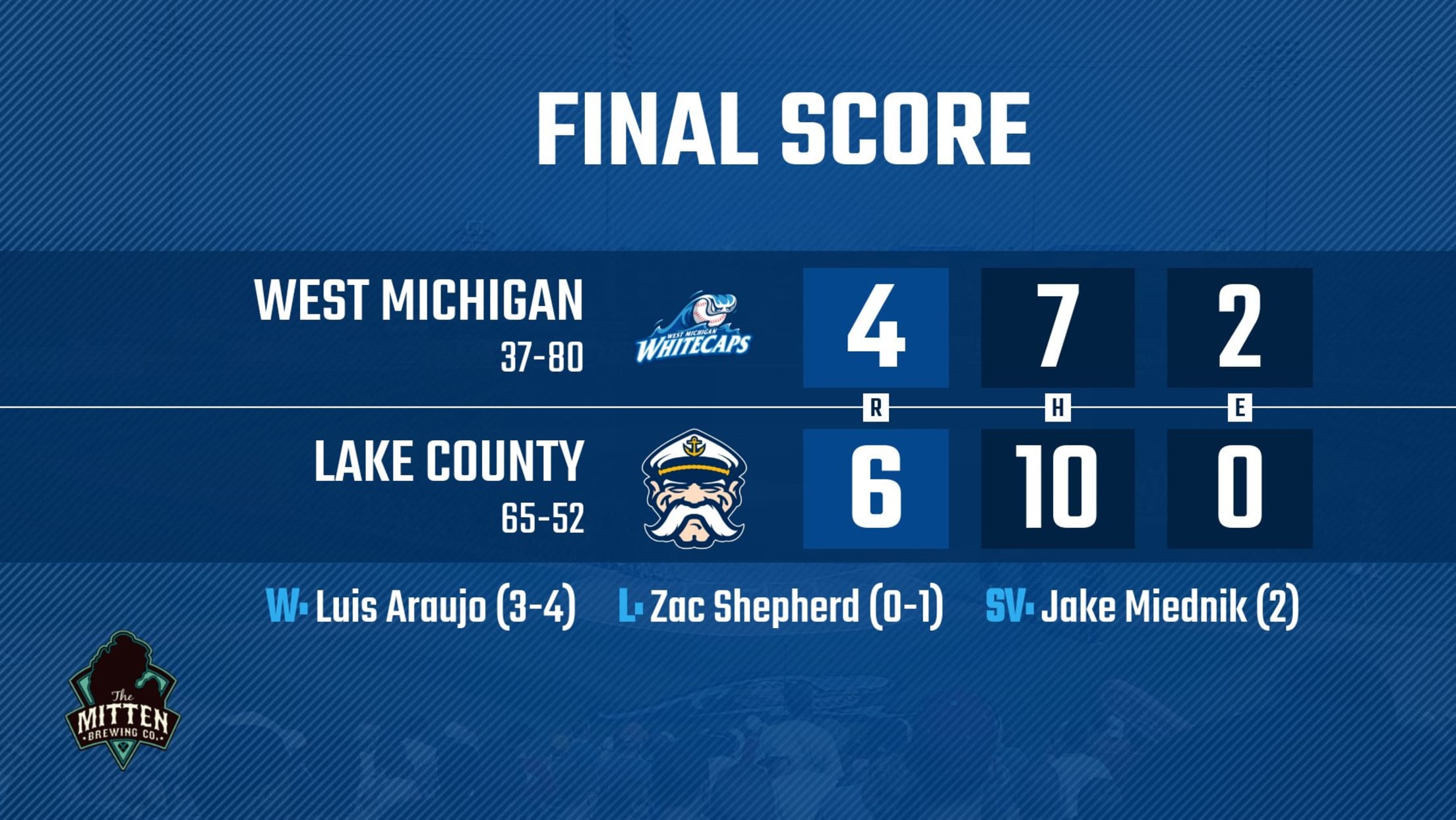 EASTLAKE, OH - The West Michigan Whitecaps kept the score close throughout a Saturday night contest but couldn't get the key hit in a 6-4 loss to the Lake County in front of 6,207 fans at Classic Park.The Whitecaps record falls to 37-80 - marking the first 80-loss season in
