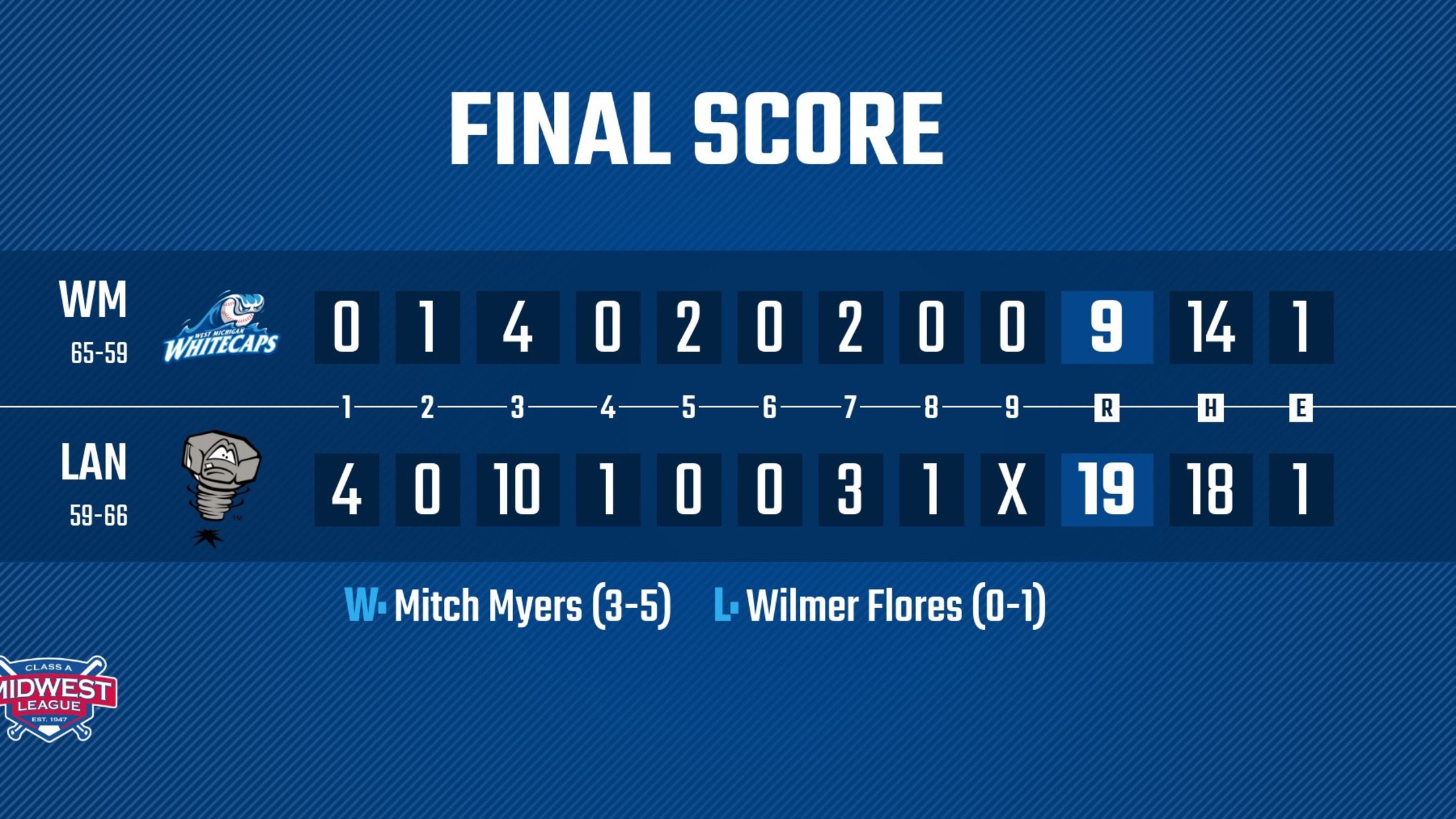 A night after a 11-10, 11-inning loss in Lansing, West Michigan fell behind 4-0 after pitcher Wilmer Flores surrendered four runs to the first five batters he faced. The Detroit Tigers Top-10 Prospect then surrendered five more runs as part of a 10-run Lugnuts third inning. The Whitecaps loss places them in a first-place tie with Fort Wayne – with the TinCaps holding the tiebreaker – with six games remaining this season.