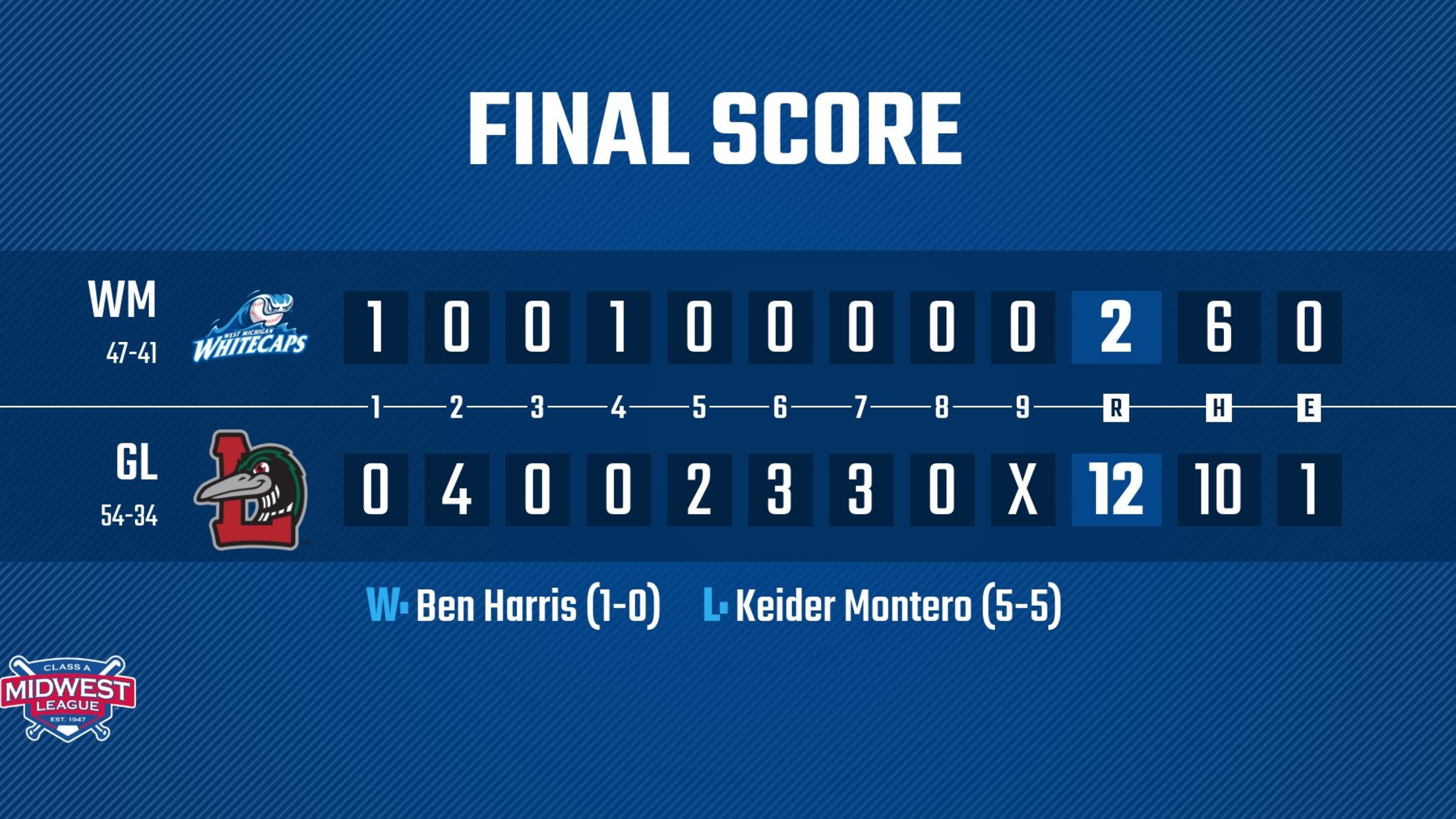 MIDLAND, MI – Catcher Diego Cartaya, one of the top prospects in Major League Baseball, slammed a two-run homer as the West Michigan Whitecaps fell to the Great Lakes Loons in front of 4,620 fans Friday at Dow Diamond by a score of 12-2. Cartaya, the No. 13 prospect in