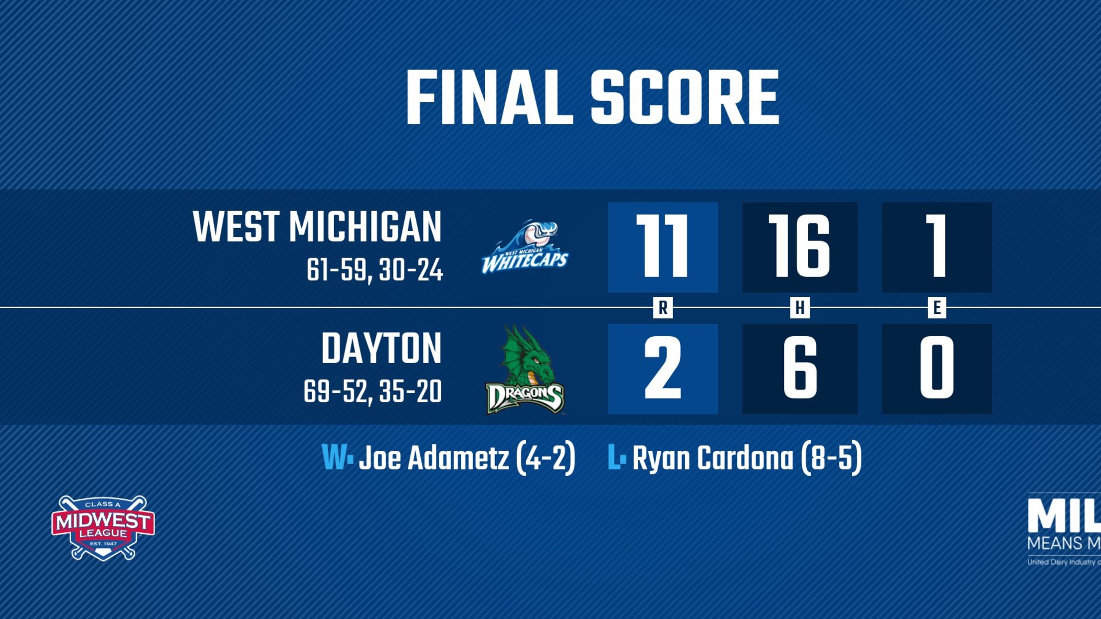 The Whitecaps jump to 30-24 in the second half and stay over .500 on the season at 61-59 overall. Whitecaps starter Joe Adametz (4-2) picks up his fourth win of the year for tossing five innings of one-run baseball, while the Dragons Ryan Cardona (8-5) suffers his fifth loss after giving up three runs in 4.2 innings on the mound. Every Whitecaps player recorded at least one base hit in the victory and were led by three hits from Peck and Clark, who reached base four times. The game was played in hot conditions, as Tuesday’s first pitch temperature registered at 93 degrees, one of the hottest recorded numbers of the season, as local temps reached the upper 90s before the contest.