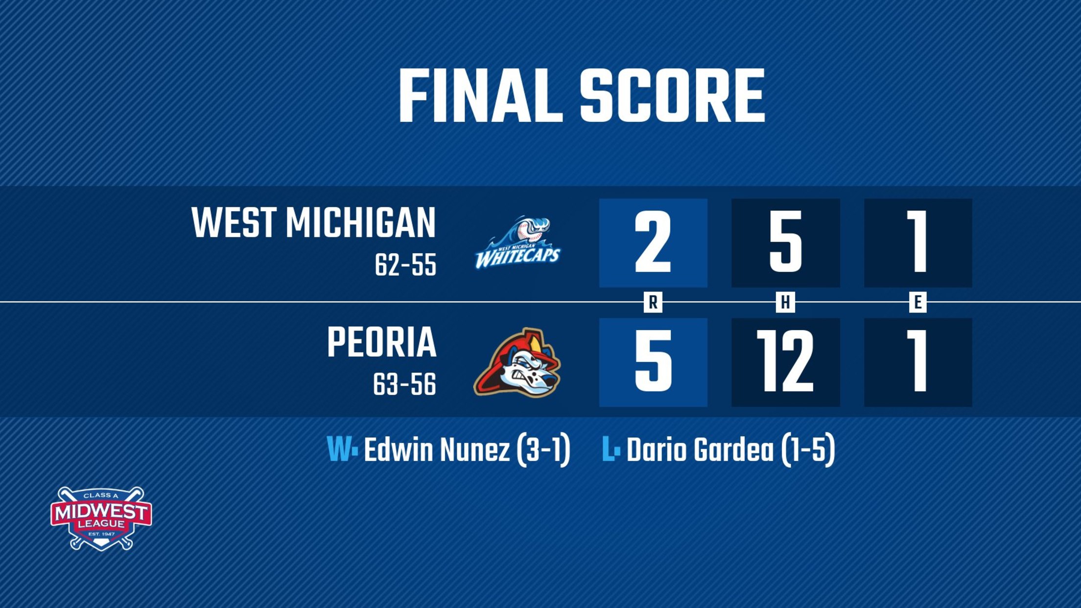 PEORIA, IL – The West Michigan Whitecaps held the lead for most of Saturday night’s contest against the Peoria Chiefs at Dozer Park but gave up five unanswered runs over the final two innings, leading to a 5-2 loss in front of 6,549 fans.