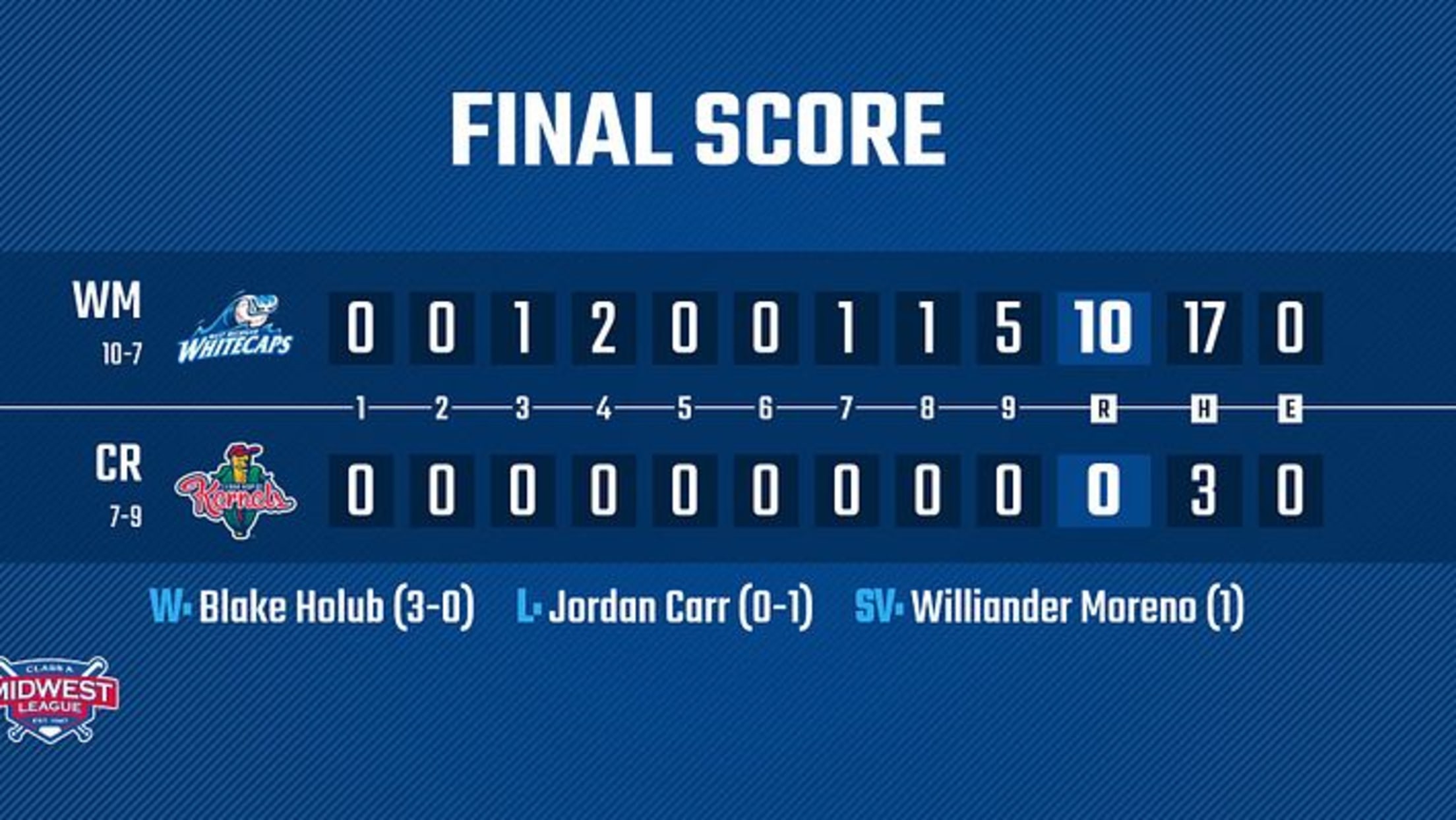 CEDAR RAPIDS, IA - The West Michigan Whitecaps suffered a shutout on Tuesday night but returned the favor on Wednesday with a 10-0 defeat of the Cedar Rapids Kernels on Wednesday night at Perfect Game Field.