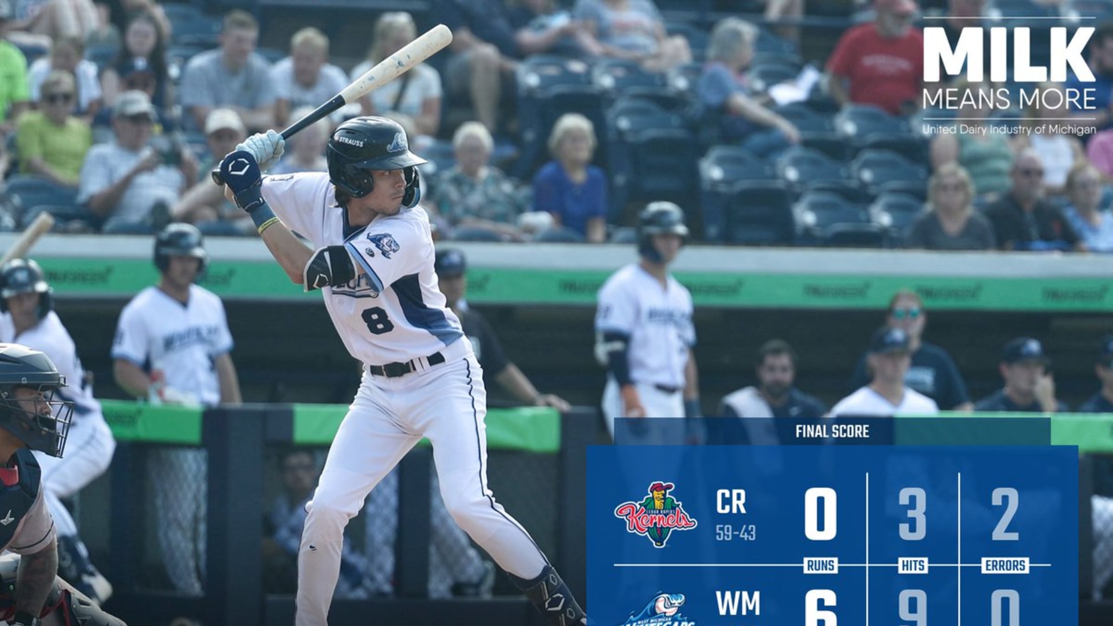 The Whitecaps improve to 25-12 in the second half and 69-33 overall, while the Kernels fall to 19-17 in the second half and 59-44 overall. Miller (7-2) secures his seventh win of the season while Kisting (1-3) suffers his third loss, allowing just one run through three innings pitched. Whitecaps first baseman Andrew Jenkins added an RBI single in the eighth inning, extending his hitting streak to 14-straight games and tying Josue Briceño for the longest streak by a Whitecaps player this season.