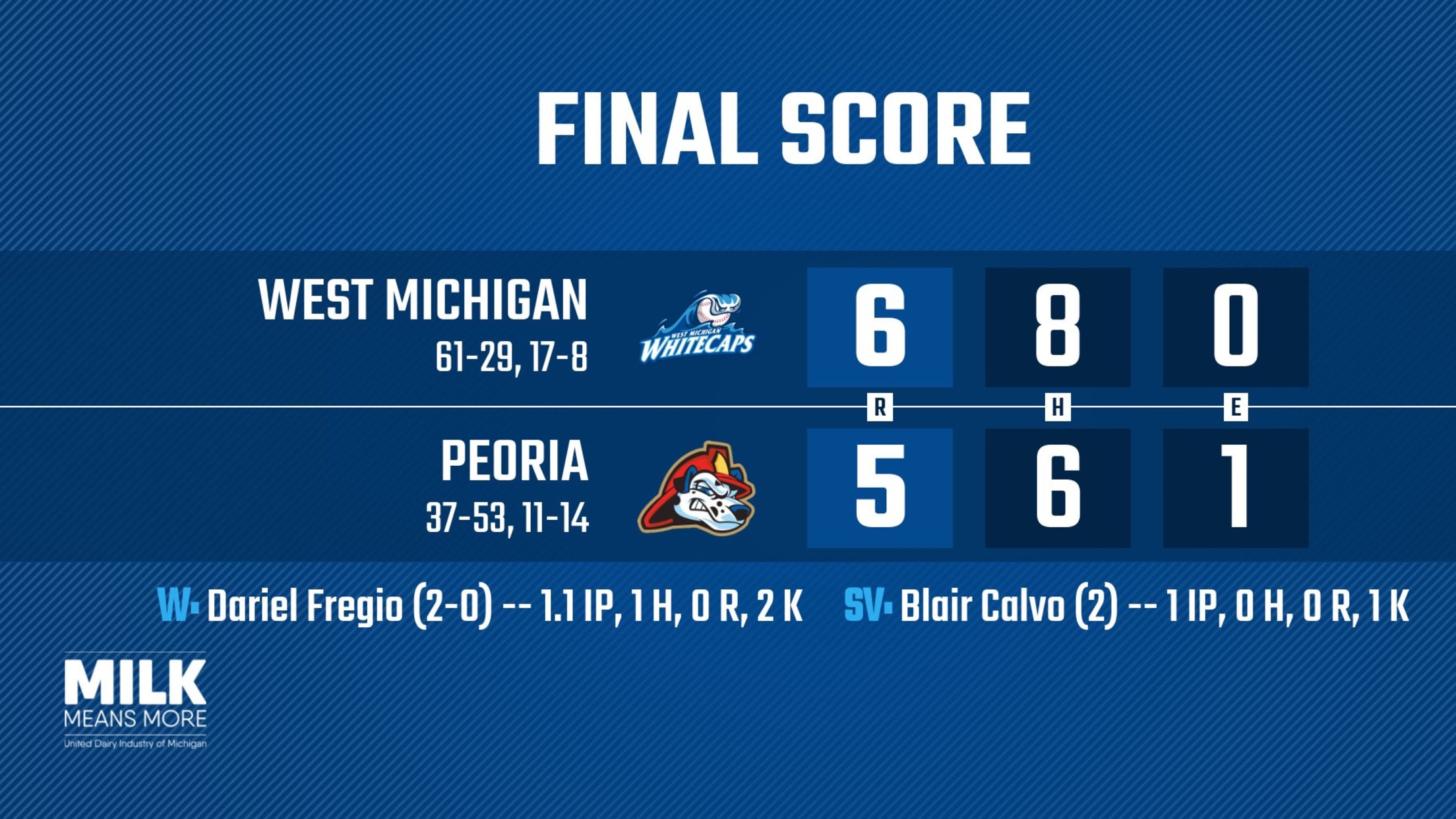 PEORIA, IL – The West Michigan Whitecaps rallied from a three-run deficit to pick up a win in the first game of a six-game series in a 6-5 victory over the Peoria Chiefs on Tuesday night at Dozer Park.