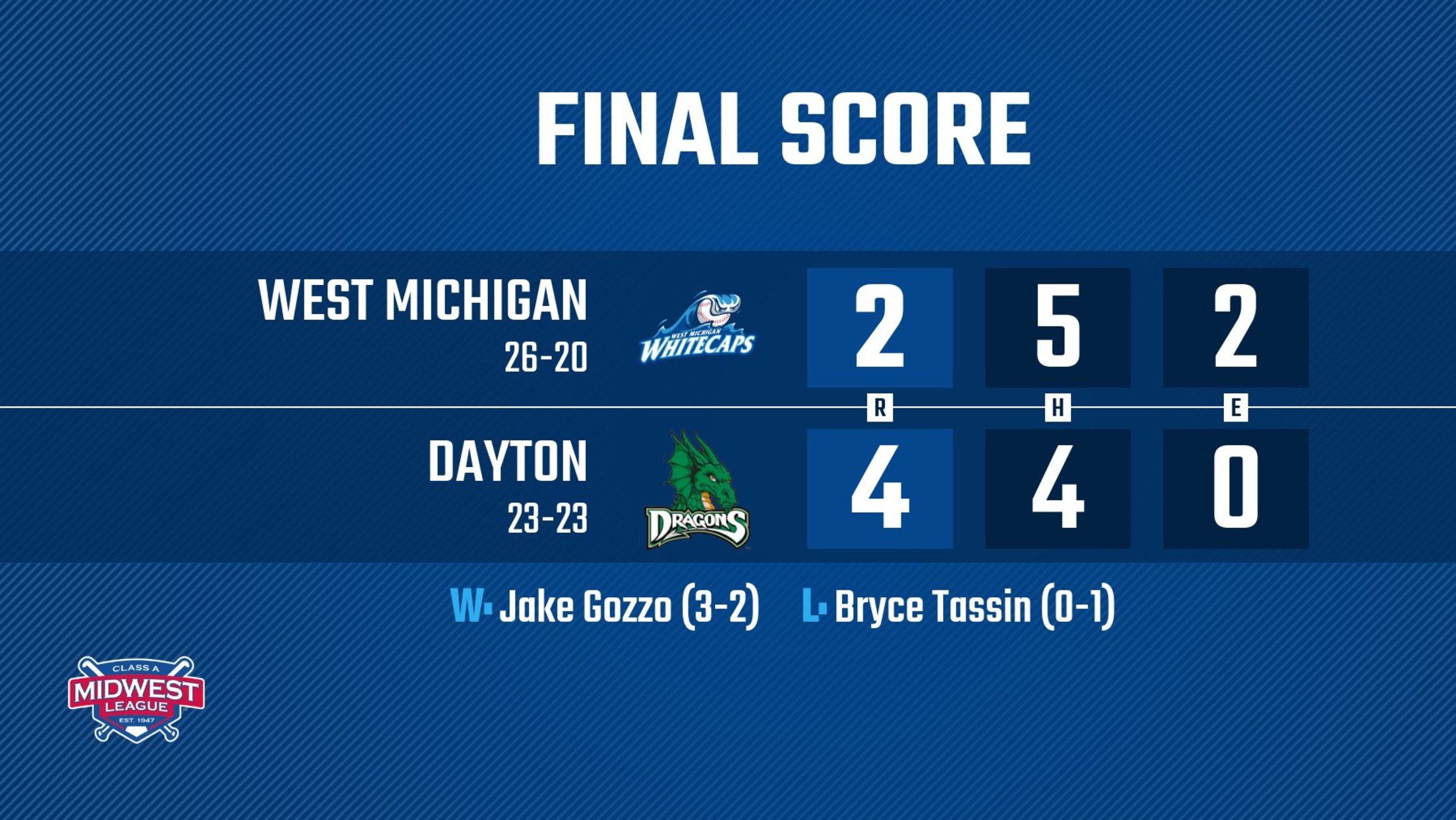 DAYTON, OH – The West Michigan Whitecaps took an early lead but couldn’t sustain it as Ruben Ibarra blasted a tiebreaking, eighth-inning two-run homer in a 4-2 loss to the Dayton Dragons in front of 8,042 fans Tuesday night at Day Air Ballpark.