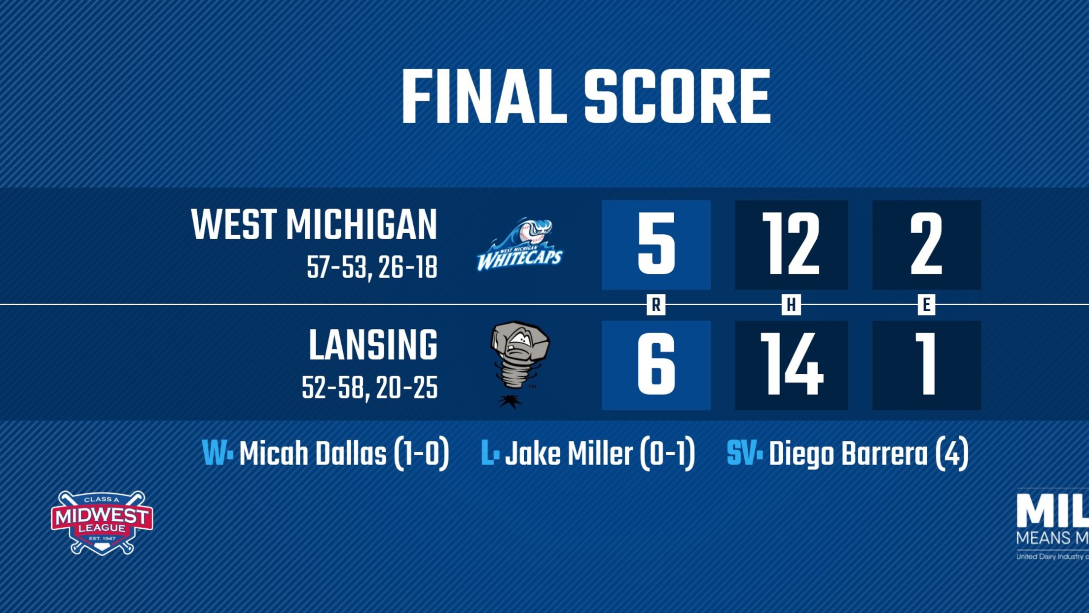 LANSING, MI — Detroit Tigers top prospect Max Clark hit his first homer at the High-A level, but the West Michigan Whitecaps came up short as part of a 6-5 loss to the Lansing Lugnuts in front of 6,628 fans on Thursday night at Jackson Field.