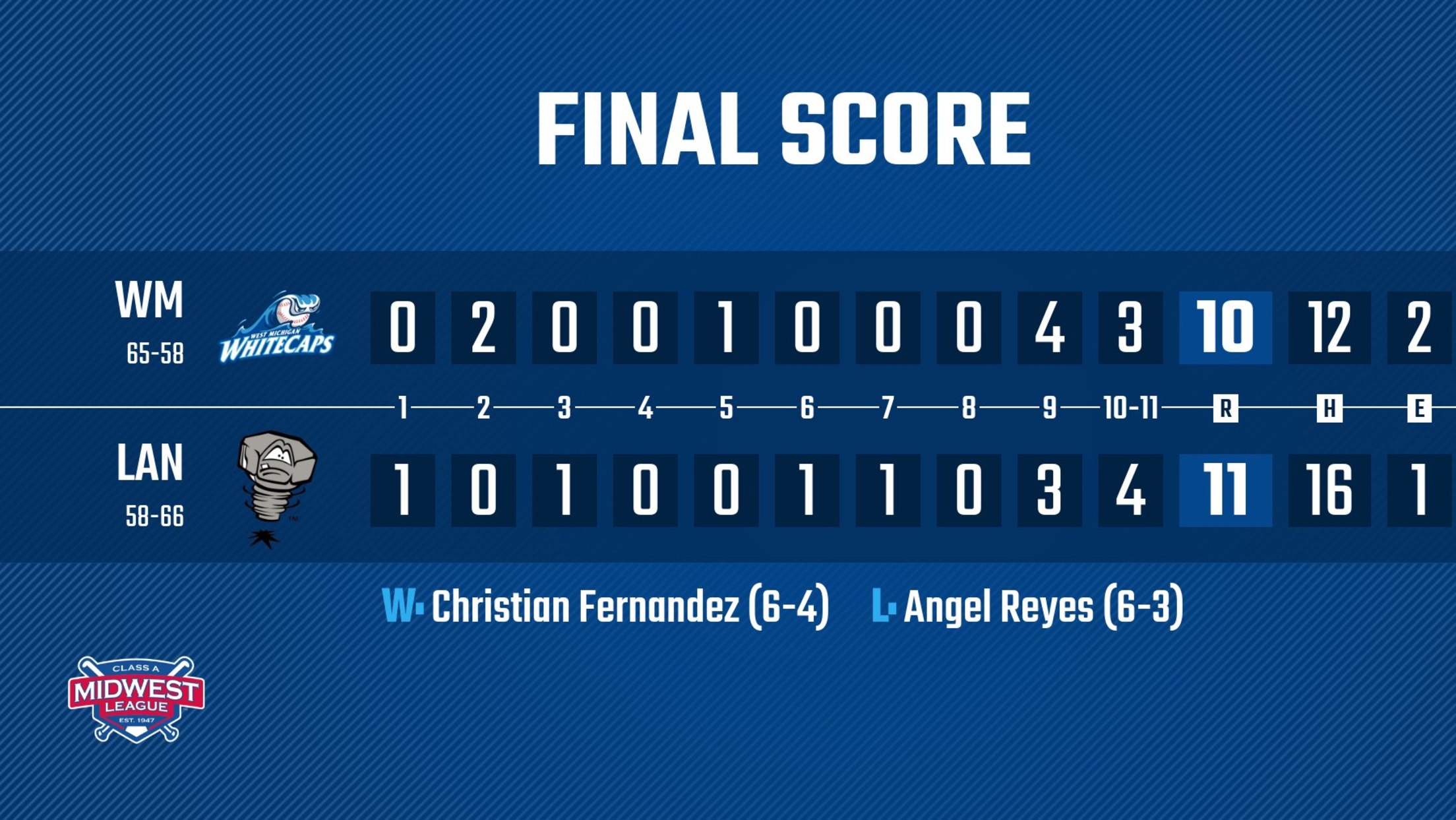 The Whitecaps record drops to 65-58 overall and 33-25 in the second half, while the Lugnuts jump to 58-66 and 27-32 in the second half. Lansing reliever Christian Fernandez (6-4) picked up his sixth win after tossing the eleventh inning, while Angel Reyes (6-3) gave up four runs in the final two innings in taking his third loss.