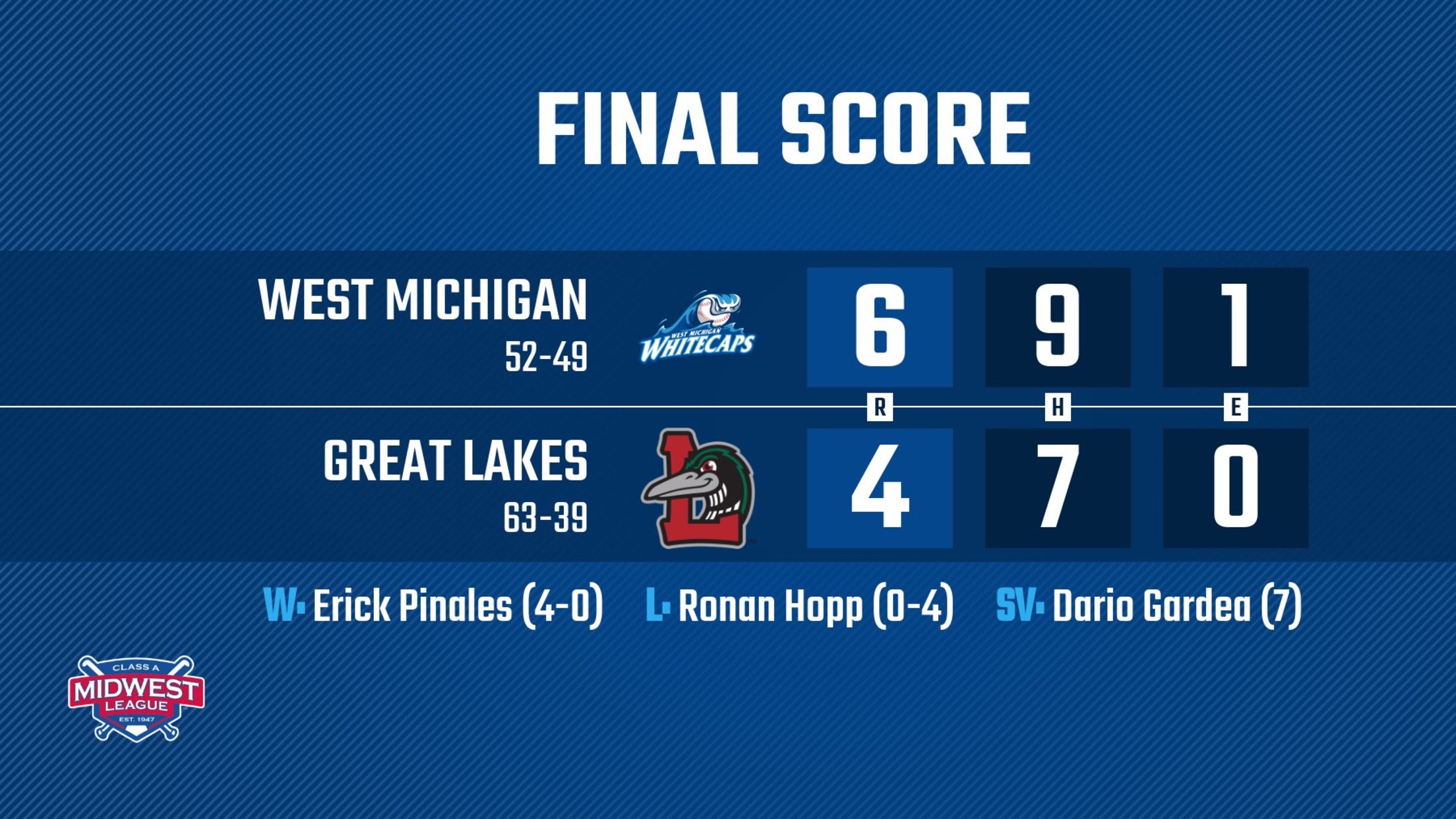 The Whitecaps improve to 52-49 overall and 20-16 in the second half, while the Loons fall to 63-39 overall and 18-19 in the second half. 'Caps reliever Erick Pinales (4-0) secures his fourth win of the year, going 1.1 innings allowing no runs with two strikeouts as Gardea collects his seventh save. Loons starter Ronan Kopp (0-4) suffers his fourth loss, allowing three runs through 2.2 innings pitched. With their eighth-straight victory, the Whitecaps have tied their longest winning streak under manager Brayan Pena. West Michigan sits just a half-game out of first place in the Midwest League East Division.