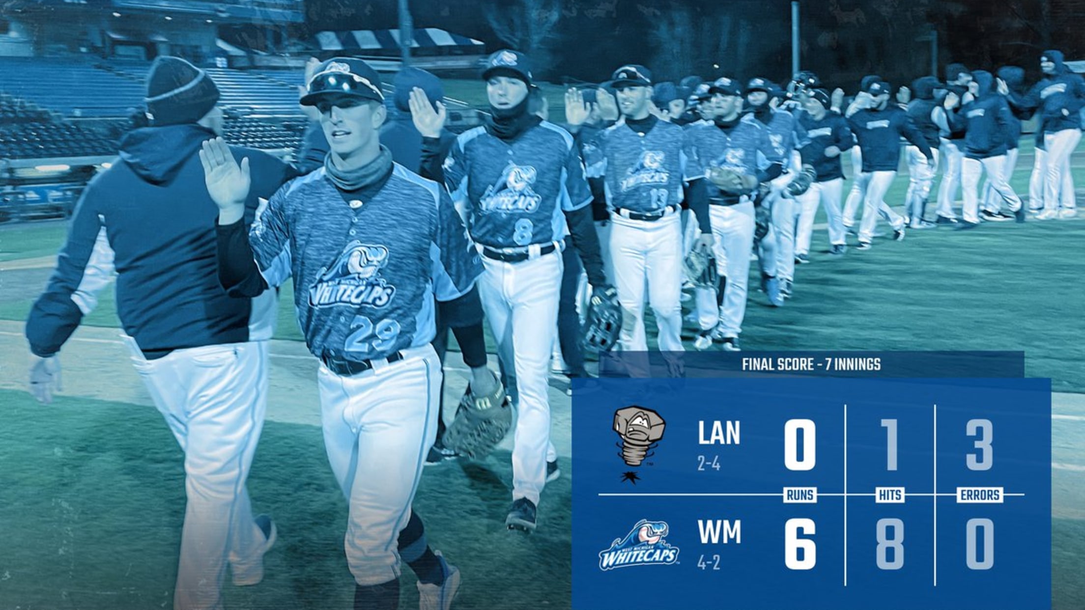 Pitching dominated in game two, holding the Lugnuts to just one hit as Wilmer Flores struck out seven ‘Nuts hitters through three perfect innings in his High-A debut. The Whitecaps plated three runs through the first two frames, highlighted by a solo homer off the bat of Meadows, to deliver West Michigan the 3-0 lead. Lansing starter Grant Holman also had the strikeout pitch working, punching out nine ‘Caps hitters, including an immaculate inning in the fourth. Meanwhile, West Michigan added to their lead across the fifth and sixth frames as Murr and Navigato added their second RBIs to put the finishing touches on the dominant 6-0 win.
