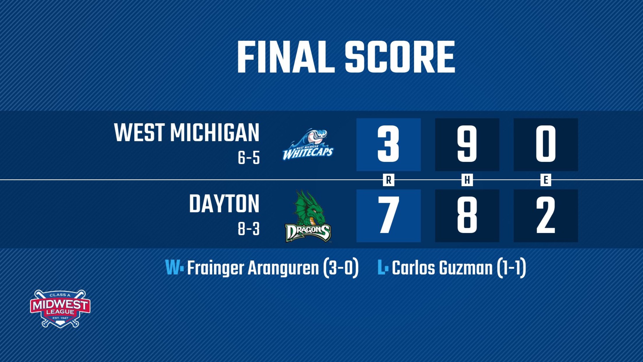Dayton improves to 8-3 with the win, while the Whitecaps fall to 6-5. Frainger Aranguren (3-0) collects his third win for Dayton with two scoreless innings, while Carlos Guzman (1-1) takes his first loss allowing five Dragons runs in three innings. Bryant Packard and Jake Holton also enjoyed multi-hit performances in a losing cause.