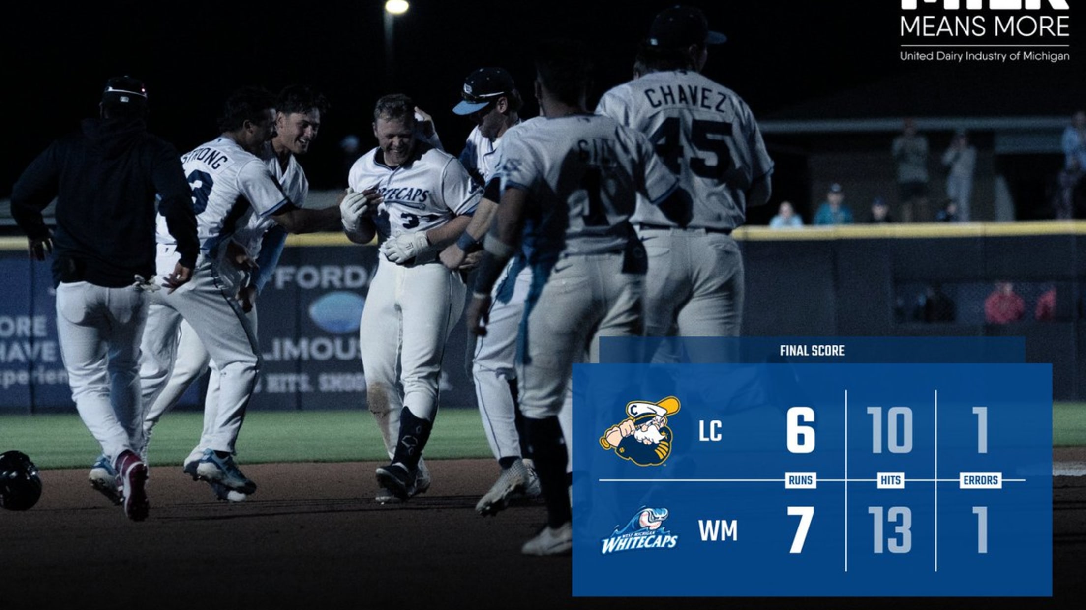 The Whitecaps grabbed the lead in the first inning as second baseman Samuel Gil plated Jackson Strong on an RBI double to take a 1-0 edge. Whitecaps starting pitcher Rayner Castillo turned in his best start of the season, tossing five scoreless innings with five strikeouts. West Michigan added to its lead in the fifth inning with two runs—highlighted by a solo home run from Nolan McCarthy—to extend the advantage to 3-0. Lake County mounted a late rally as first baseman Nolan Schubart responded with a solo homer before the Captains erupted for five runs in the eighth—highlighted by a two-run double from outfielder Aaron Walton—to jump ahead 6-3. Pennington answered in the eighth and ninth, blasting a two-run homer over the left-field wall before delivering the game-winning hit in the ninth to give the ‘Caps their first walk-off victory of the season.