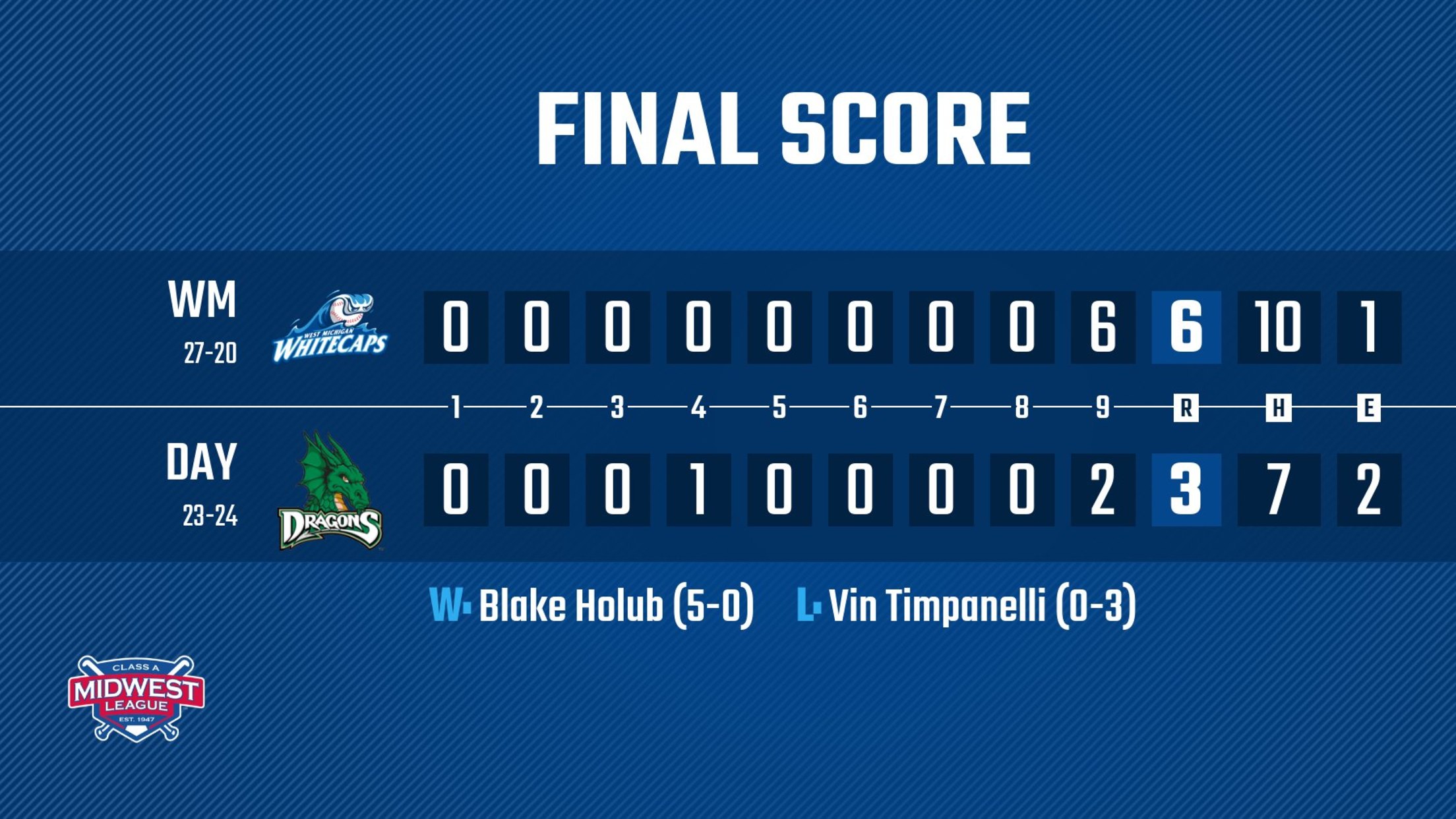 The ballgame began with a pitchers duel, as Dayton’s Chase Petty tallied eight strikeouts in four scoreless innings. Meanwhile, Garrett Burhenn pitched a Whitecaps season-best six innings of one-run baseball and striking out eight. Burhenn’s lone blemish was a pair of softly-hit singles from Austin Callahan and Austin Hendrick who combined to score Dayton’s first run in the fourth. The score remained the same until the ninth, as Dayton stranded multiple scoring opportunities in the later frames. In the ninth, Allen blasted his third homer as a Whitecaps and sixth of the 2023 season to give the ‘Caps their first lead of the night at 2-1. Later in the inning, Roberto Campos delivered some insurance with a two-run single and Jace Jung blasted a two-run homer to conclude the six-run ninth. Justice Thompson collected a run-scoring triple and scored on a throwing error before reliever Erick Pinales finished the ninth and gave the Whitecaps a Wednesday win.