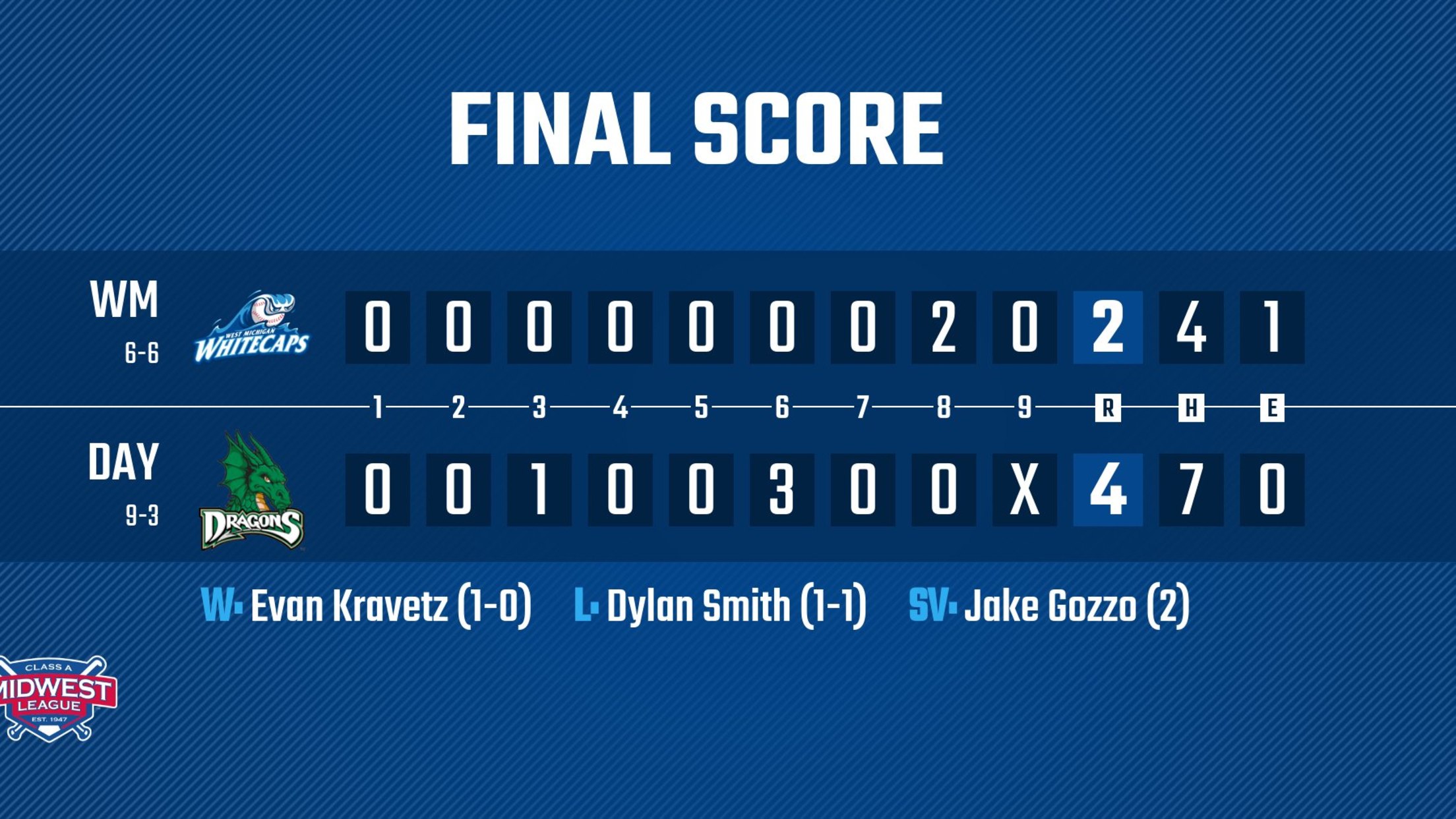 Dayton improves to 9-3 with the win, while the Whitecaps fall to 6-6. Evan Kravetz (1-0) tossed five no-hit frames in picking up his first win, while Smith (1-1) took his first loss after allowing just a single run in four innings. Dragons reliever Jake Gozzo finished the contest by collecting his second save. Cruz reached base twice in a losing cause for the Whitecaps.