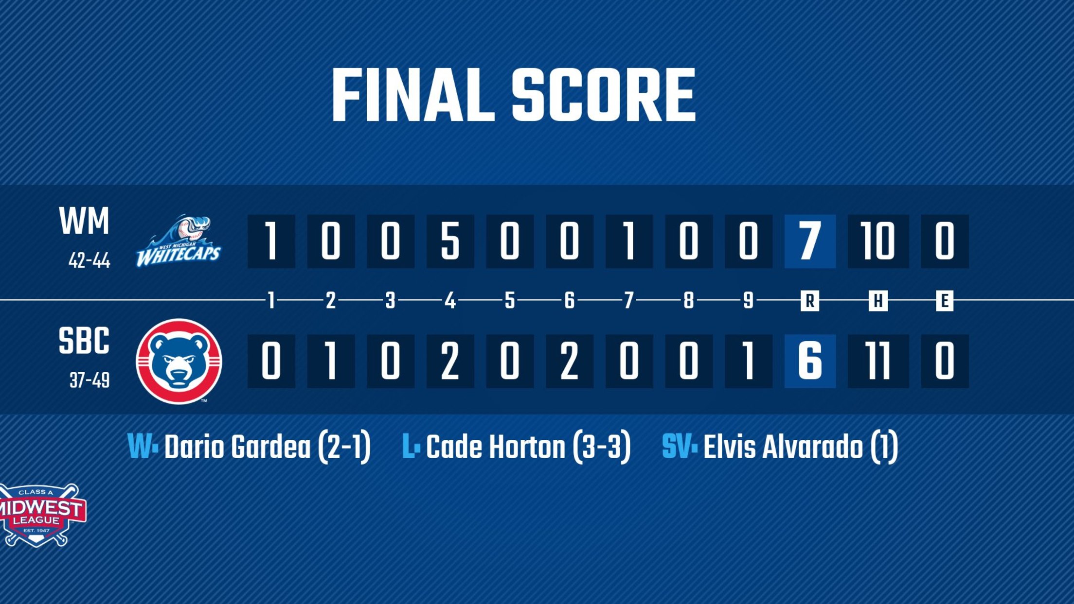 The Whitecaps record improves to 42-44 overall and 10-11 in the second half, while the Cubs drop to 37-49 and 7-14 in the second half. West Michigan used six relief pitchers to cover the nine-inning contest on Thursday, with Angel Reyes opening the ballgame with three innings of one-run baseball. Dario Gardea (1-2) tossed two scoreless frames out of the bullpen, while Cade Horton (3-3) took his third loss. Alvarado picked up his first save of the season. Campos and Dillon Paulson each collected a pair of hits in the victory. Base umpire Brandon Tipton ejected Cubs manager Lance Rymel for arguing a potential home run in the fifth inning.