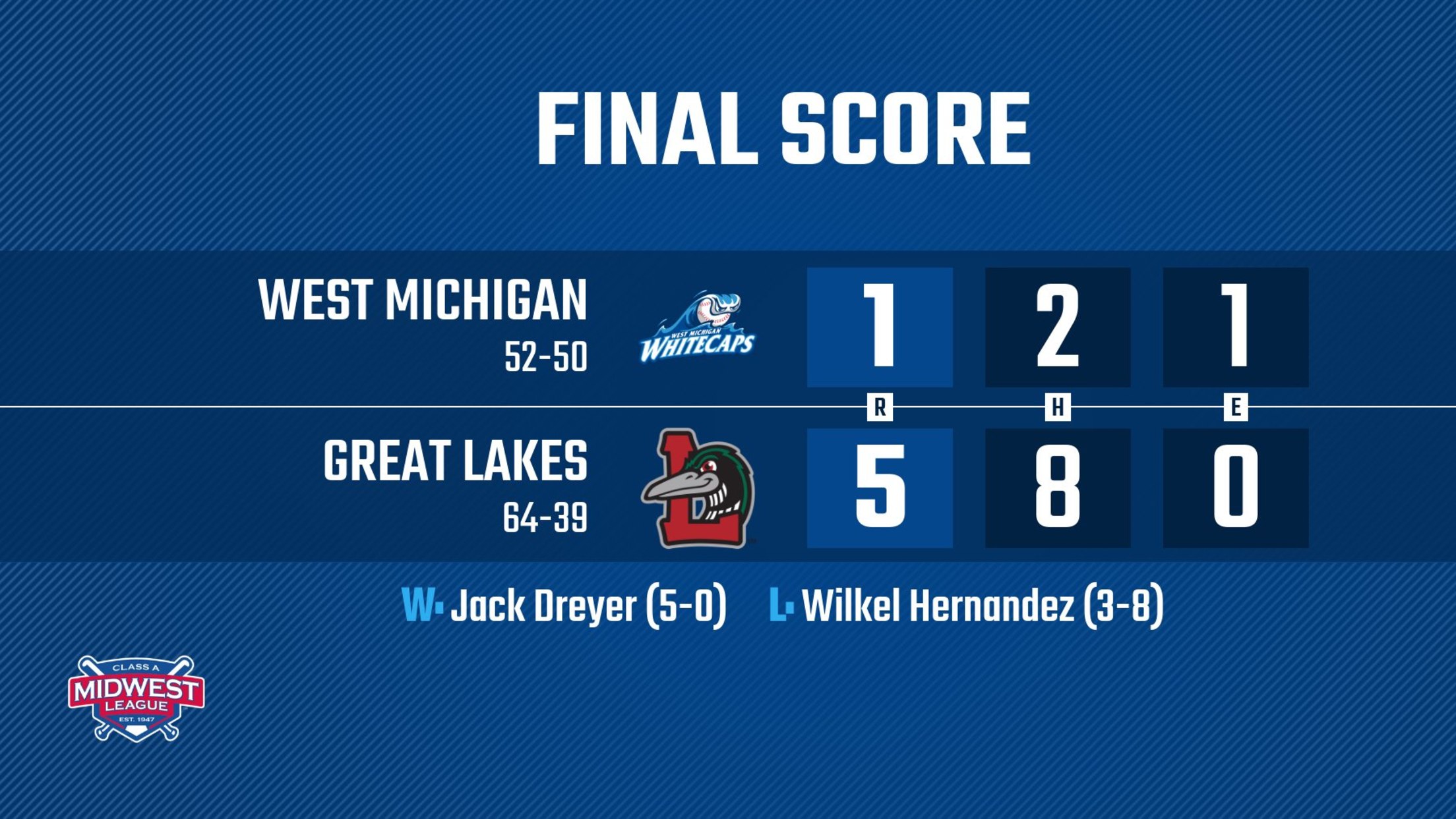 The Whitecaps fall to 52-50 overall and 20-17 in the second half, while the Loons improve to 64-39 overall and 19-19 in the second half. Loons reliever Jack Dreyer (5-0) secures his fifth win of the year, tossing 2.2 scoreless innings with three strikeouts, while Whitecaps starter Wilkel Hernandez (3-8) suffers his eighth loss of the season, allowing three runs through five innings of work. The Whitecaps win streak ends at eight straight, tying their longest winning streak under manager Brayan Pena. West Michigan now sits 1.5 games out of first place in the Midwest League East Division and is tied with the Dayton Dragons in second place.