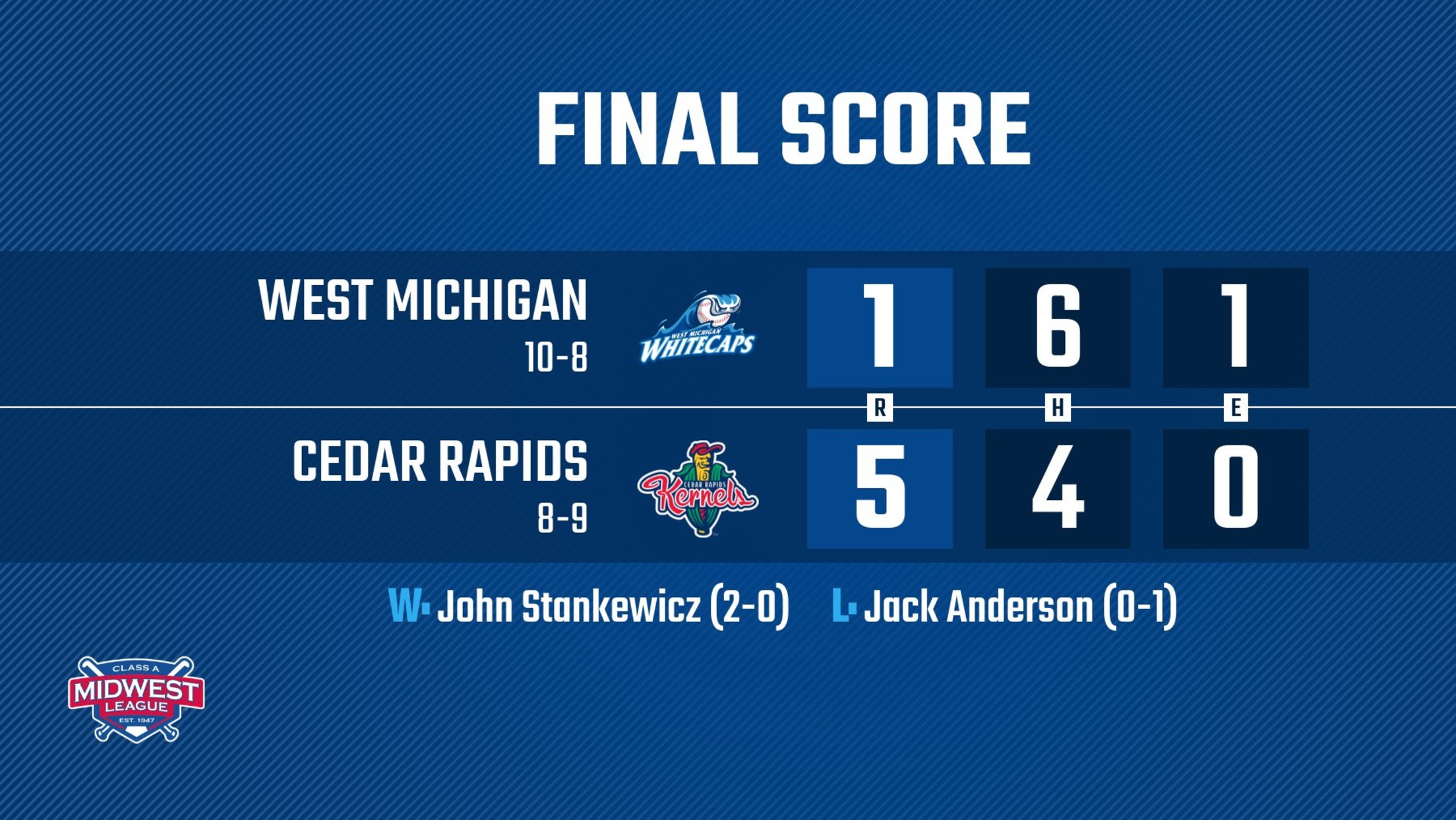 CEDAR RAPIDS, IA - The West Michigan Whitecaps dropped their third game in their last four contests, taking a 5-1 loss to the Cedar Rapids Kernels on Thursday night at Perfect Game Field.