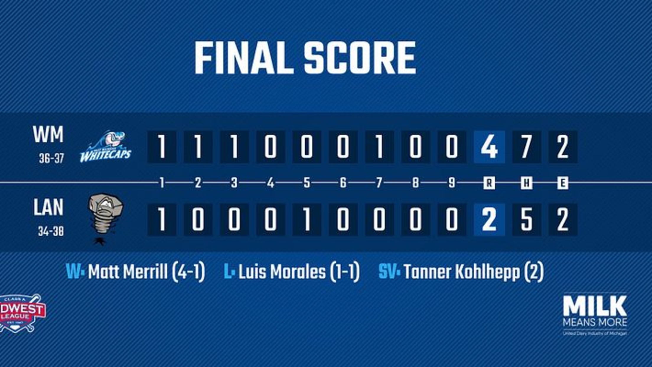 The Whitecaps improve to 36-37 and 5-2 in the second half, while the Lugnuts drop to 34-38 overall and 2-5 in the back half of 2024. Merrill (4-1) tossed 1.1 scoreless innings while striking out three to get his fourth win of the season, while Lansing starter Luis Morales (1-1) gave up three runs in 3.1 frames in taking his first loss. Kohlhepp tossed a scoreless ninth to pick up his second save of the season. Jarvis has reached base in seven of his last ten at-bats and teamed up with Stephenson with a pair of hits in the Whitecaps victory.