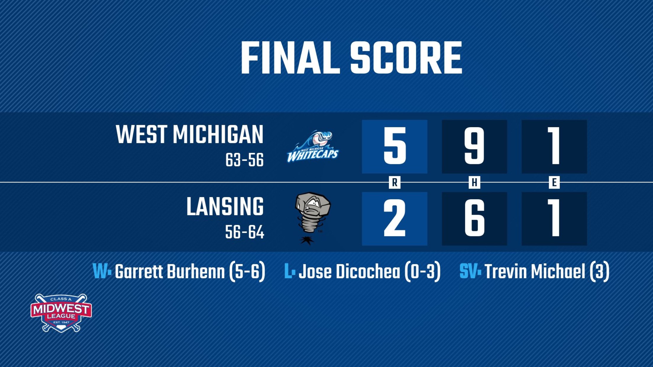 LANSING, MI – The West Michigan Whitecaps rode an outstanding pitching performance from right-hander Garrett Burhenn, and its bullpen held on in the late innings as part of a 5-2 win over the Lansing Lugnuts on Tuesday at Jackson Field.