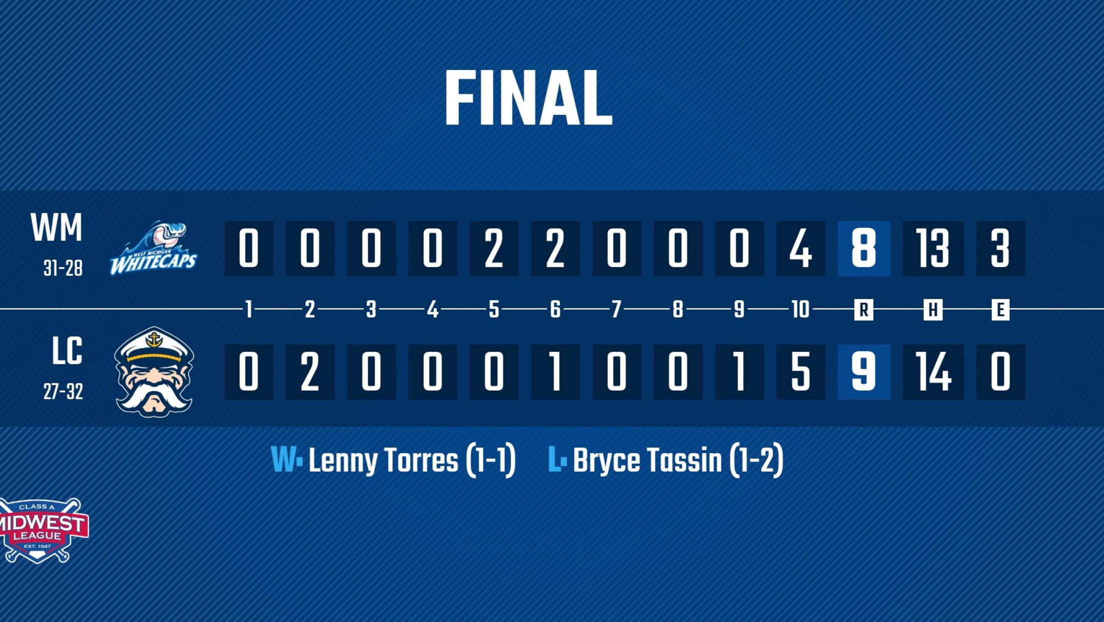 Three errors, including a dropped tenth-inning pop-up to end the game as a Whitecaps victory, led to a walk-off RBI-single from Justin Boyd to give Lake County one of its most unexpected wins in recent memory. Of the nine runs Whitecaps pitchers allowed in the contest, only three of them were earned runs.