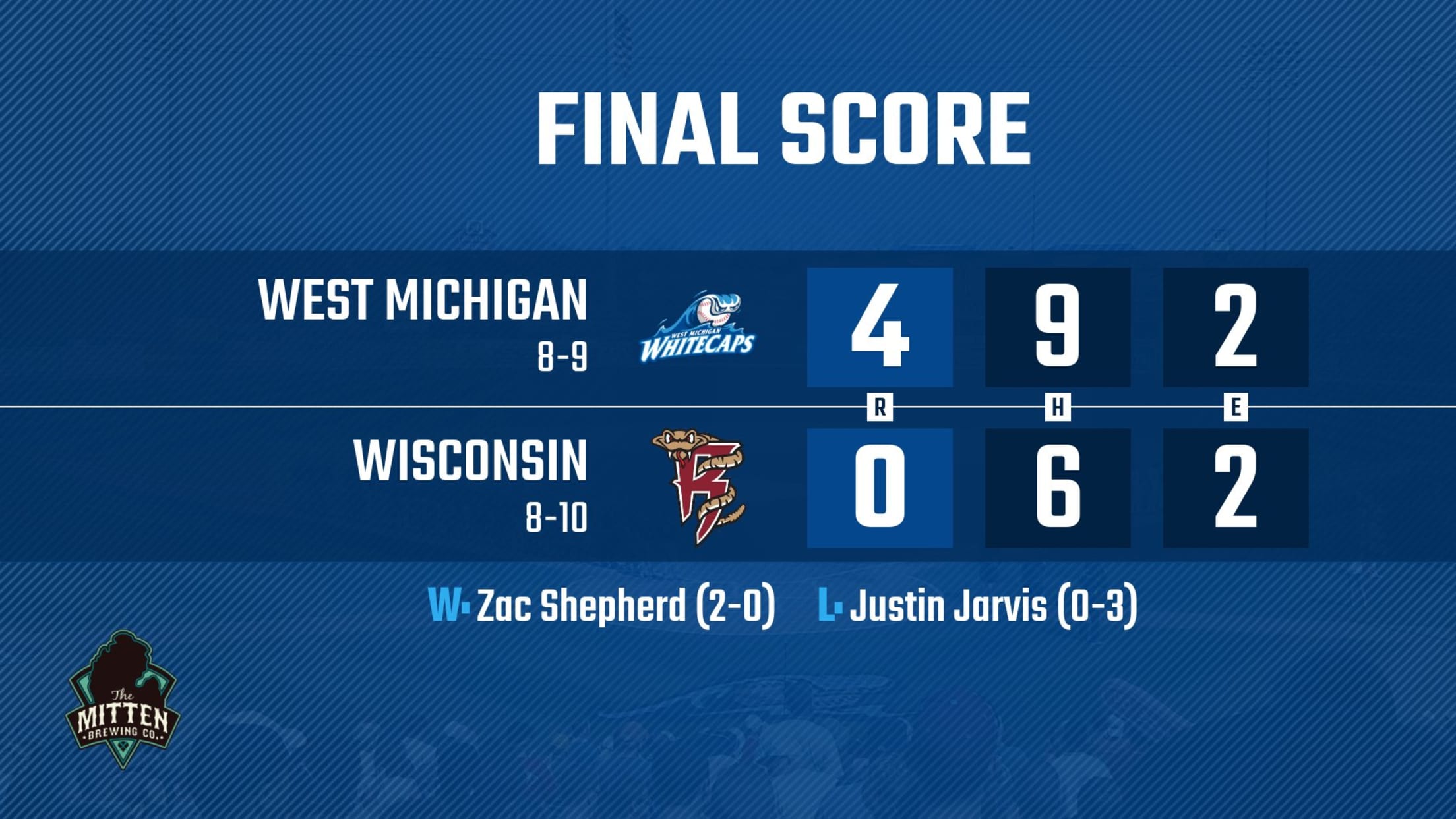 On the mound, Fernander took his spot-start three scoreless innings while striking out four before Zac Shepherd (2-0) tossed 1.2 innings with two strikeouts to earn his second victory of the season. Timber Rattlers starter Justin Jarvis (0-3) took the tough-luck loss despite five innings of one-run ball. The Whitecaps improve to 8-9 while the Timber Rattlers fall to 8-10. Rivera and Eliezer Alfonzo each recorded two hits in the victory.