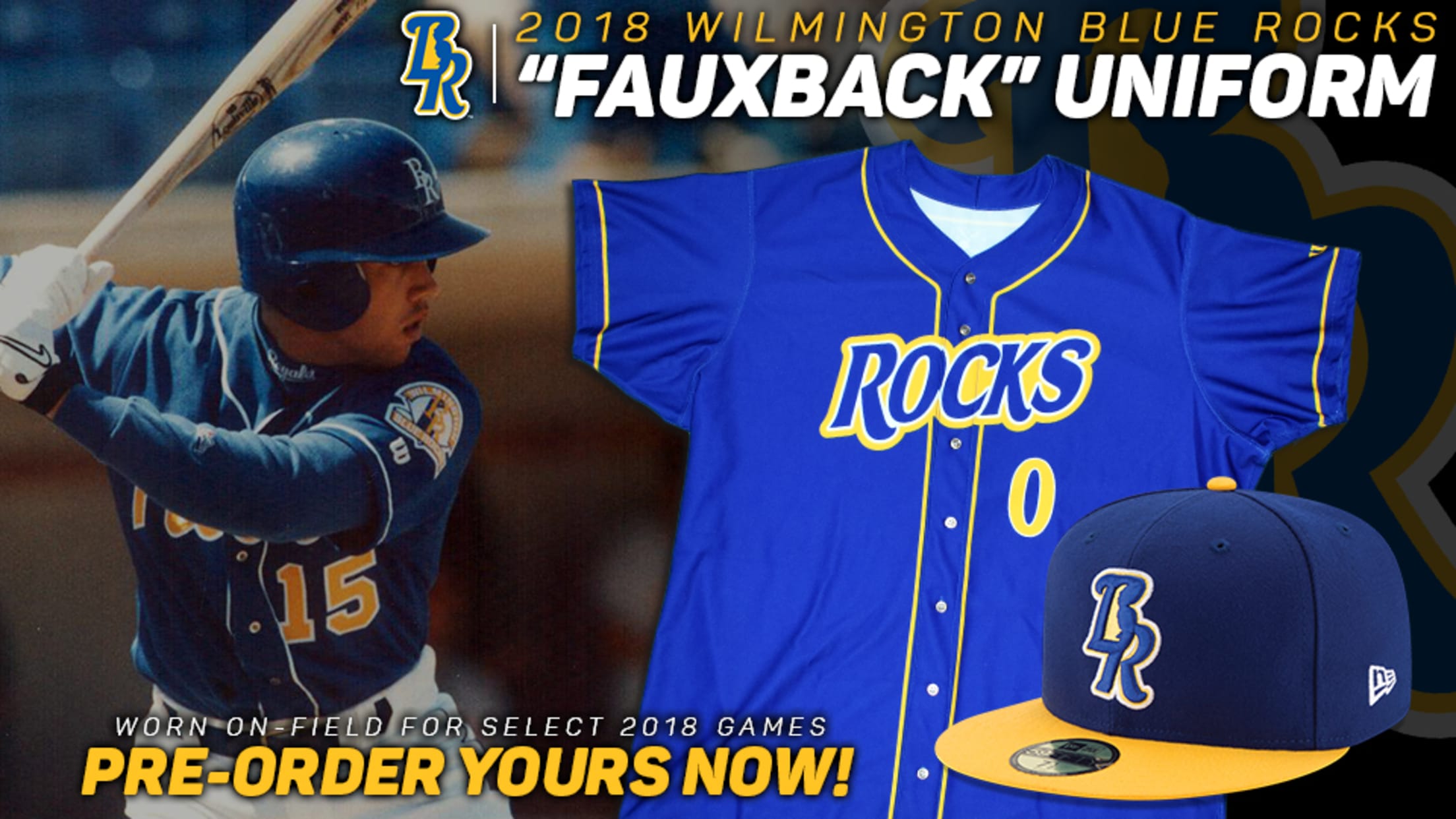 Wilmington, DE -- Thanks to the overwhelming popularity of last year' 25th season faux-throwback jerseys, the Wilmington Blue Rocks are unveiling a new 'fauxback' style uniform for the 2018 campaign. In an homage to the franchise's mid-90's threads, the Blue Rocks will wear royal blue jersey tops with the original royal blue and yellow caps during all Saturday games at Frawley Stadium, as well as select other dates.