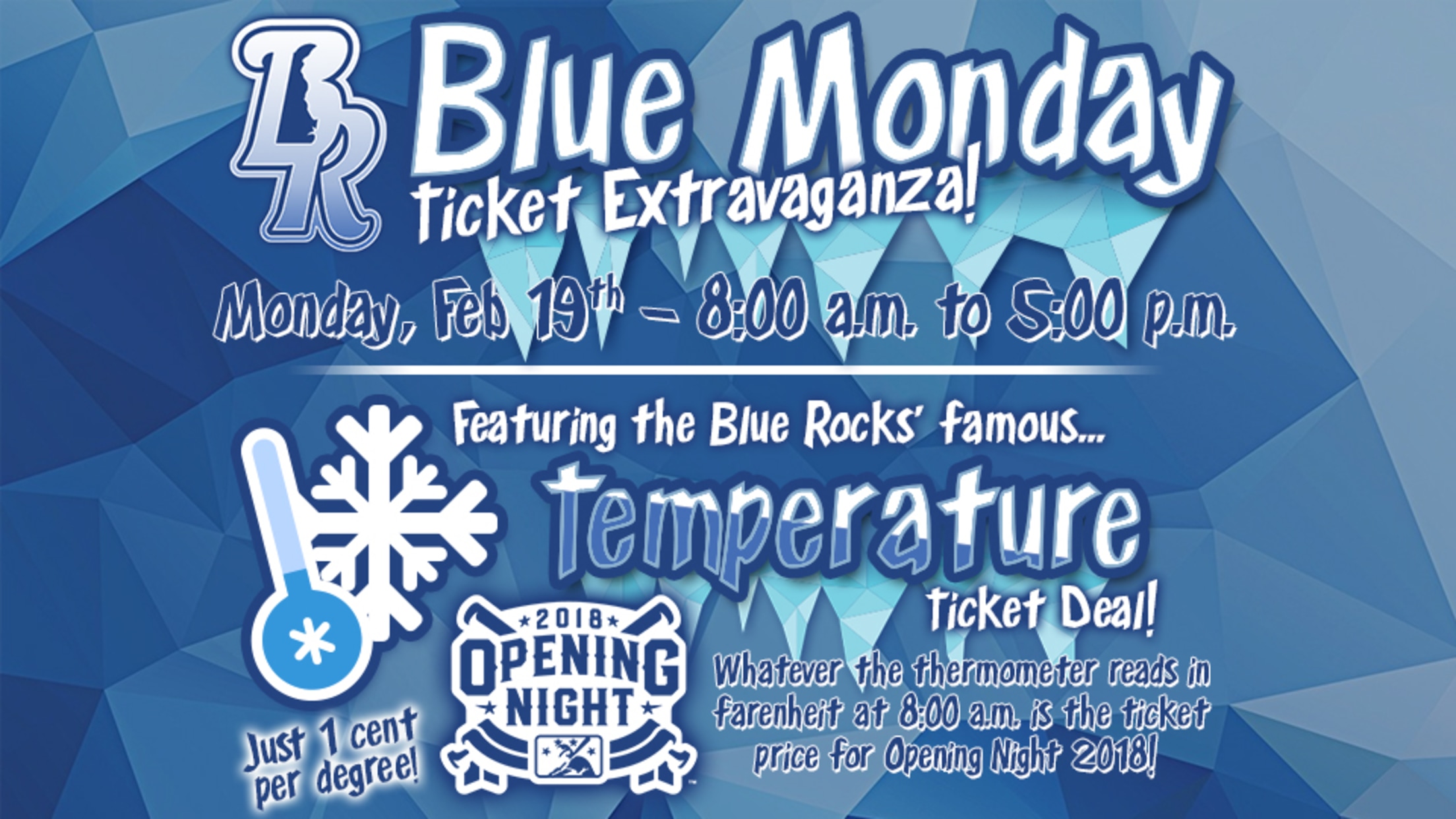 Wilmington, DE -- Celebrate this Presidents' Day by purchasing individual tickets for the Wilmington Blue Rocks' 2018 season during the organization's annual "Blue Monday" Ticket Sales Extravaganza. Opening Day ticket prices will be set by the temperature at 8 a.m. on the morning of February 19. There will also be