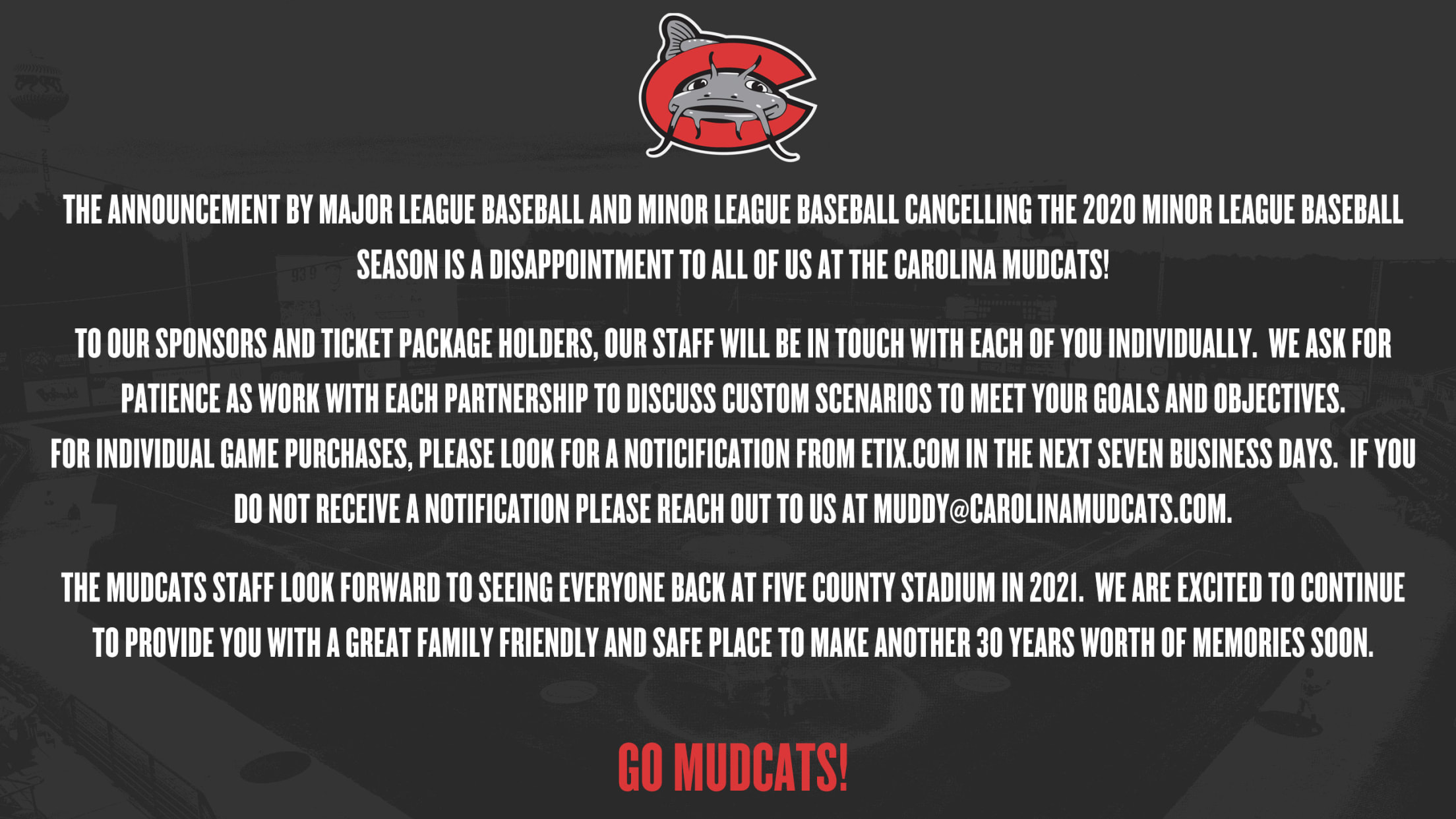To our great fans, many of you who have been part of some of the great moments over the past 30 years, we will be sharing plans to continue the tradition of Mudcats Baseball soon.