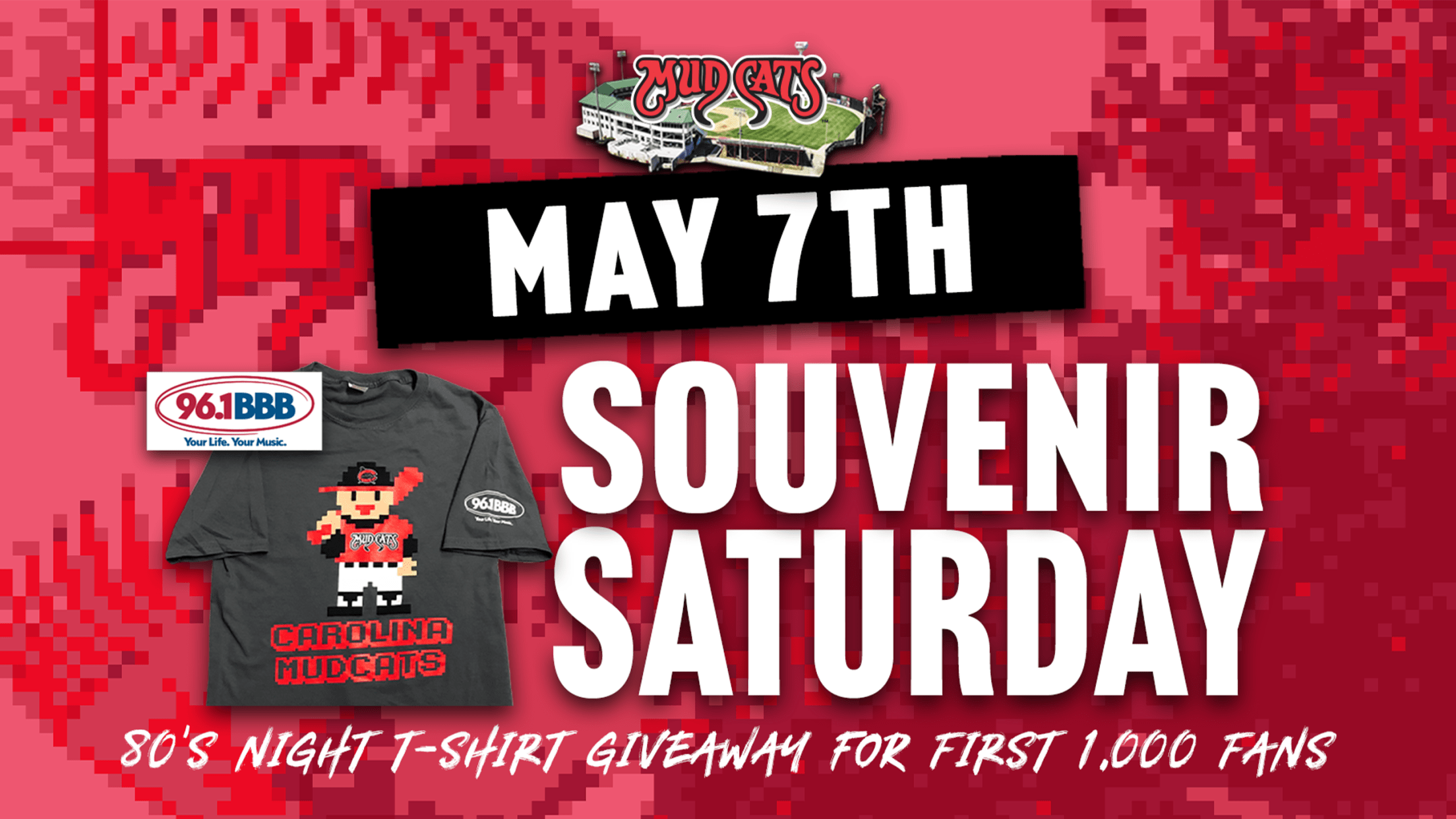 Saturday's 80’s Night souvenir t-shirt giveaway is presented by 96.1 BBB. The first pitch is scheduled for 5:00 p.m. and the Five County Stadium gates will open at 4:00 p.m. Tickets are available at www.carolinamudcats.com.