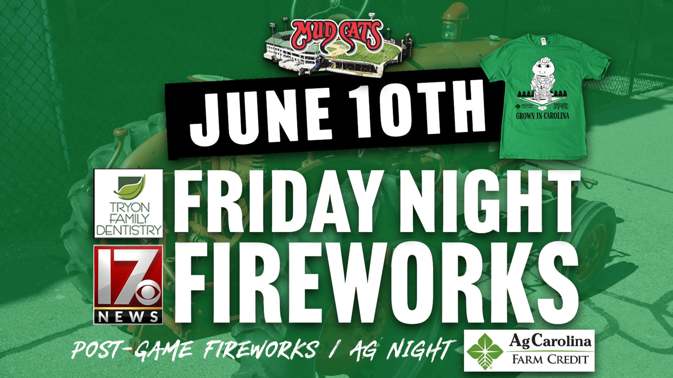 ZEBULON - The Carolina Mudcats once again team with AgCarolina Farm Credit for Agriculture Night on Friday, June 10 at Five County Stadium. Agriculture Night is highlighted by post-game fireworks and a one-of-kind souvenir t-shirt giveaway for the first 1,000 fans with paid admission at Five County Stadium.