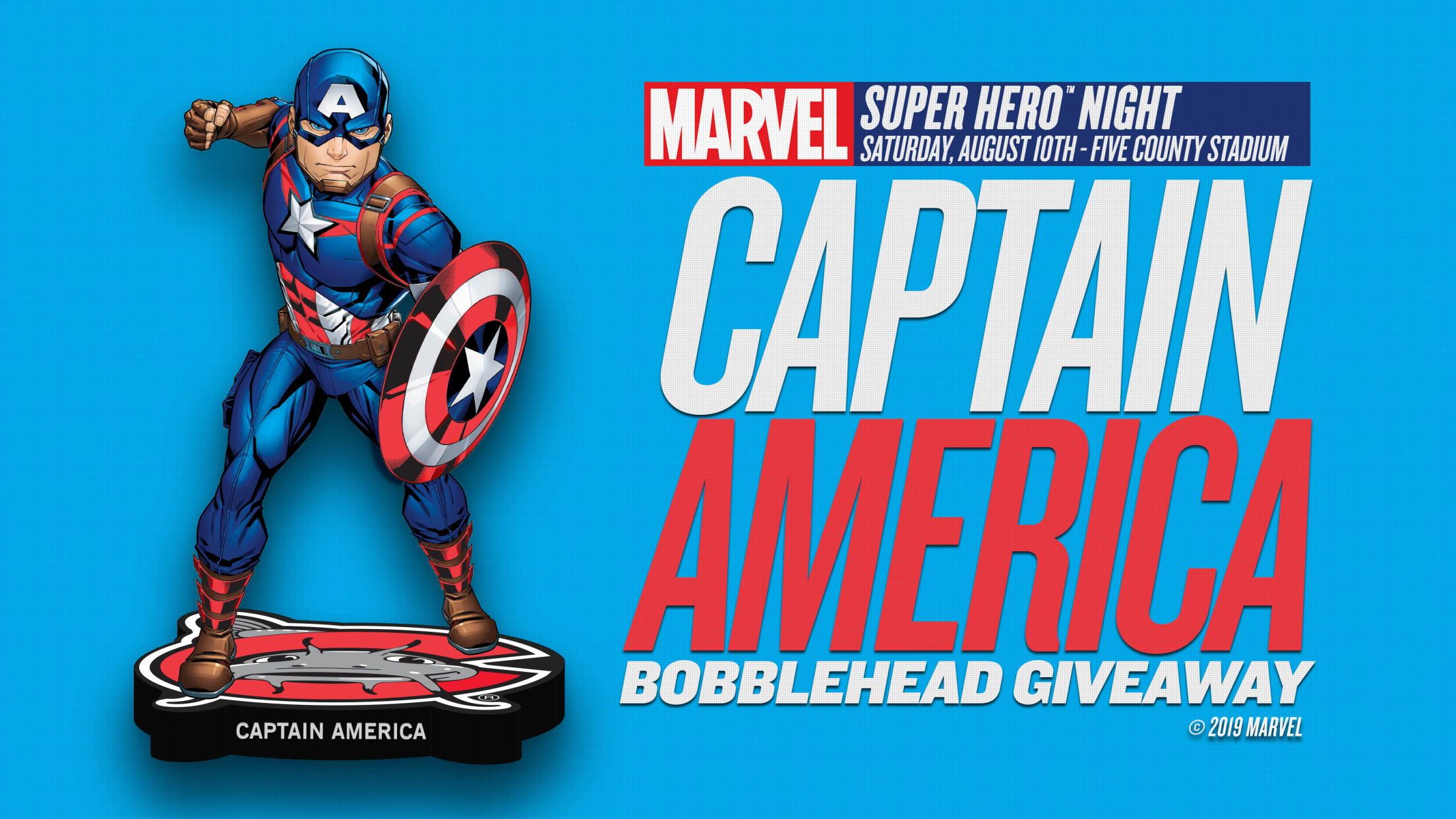 Additionally, a limited number of the Captain America bobbleheads will be available to fans in advance with the Marvel Super Hero™ Night "Avoid the Line" Ticket Package. This package includes the Captain America bobblehead, a ticket to Marvel Super Hero™ Night on August 10 and a ticket to four select "Pick 5 Plan" games spread throughout the 2019 season for just $35.00.